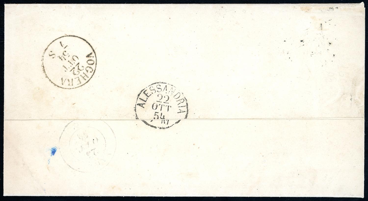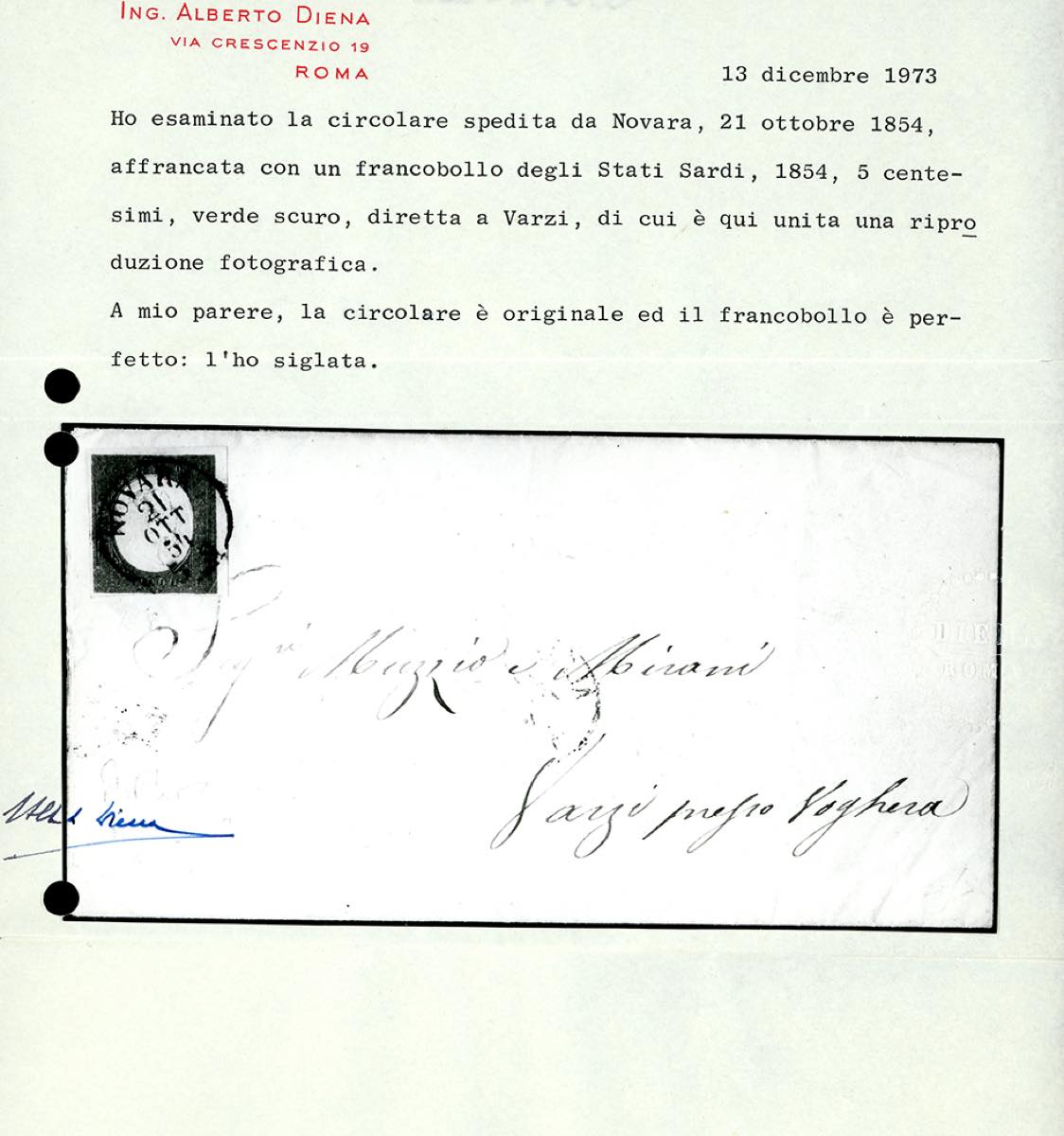 1854 - 5 cent. verde scuro, III emissione (7e), perfetto, isolato su circolare a stampa da Novara 21/10/1854 a Varzi. Pregevole tinta, impreziosita dall'uso isolato. Cert. A.Diena e Ferrario.