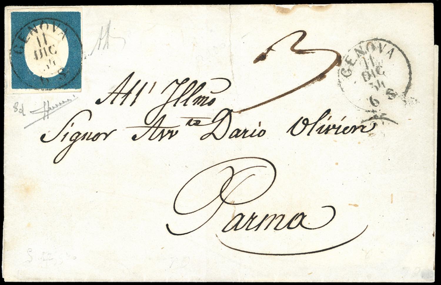 1854 - 20 cent. azzurro verdastro (8d), sfiorato a sinistra, su lettera da Genova 11/12/1854 a Parma, tassata in arrivo 30 cent. perché ... Read more