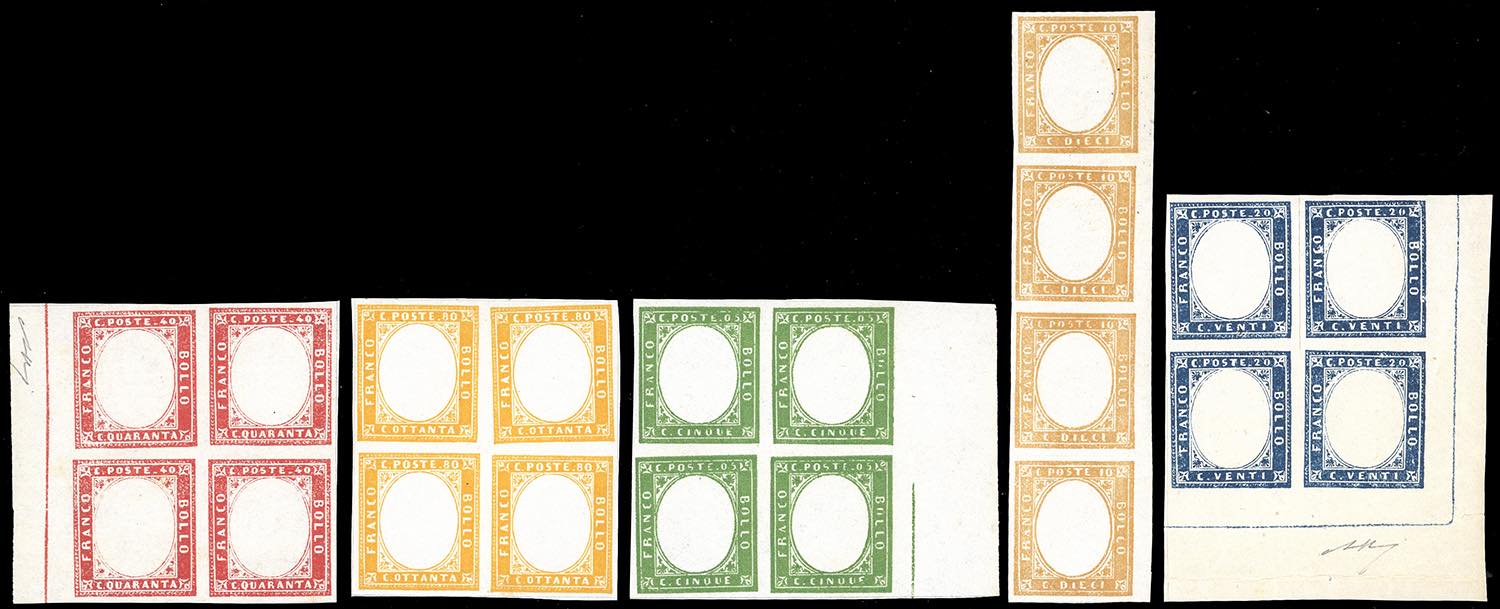 1863 - 5 cent., 10 cent., 20 cent., 40 cent., 80 cent., IV emissione, SENZA EFFIGIE, francobolli naturali (cat.Bolaffi 10B,11B,12B,13B,14B, € 78.000+), blocchi di 4, ad eccezione del 10 cent. in striscia di 4, gomma originale integra, un solo francobollo da 10 cent. con linguella, perfetti e molto freschi.