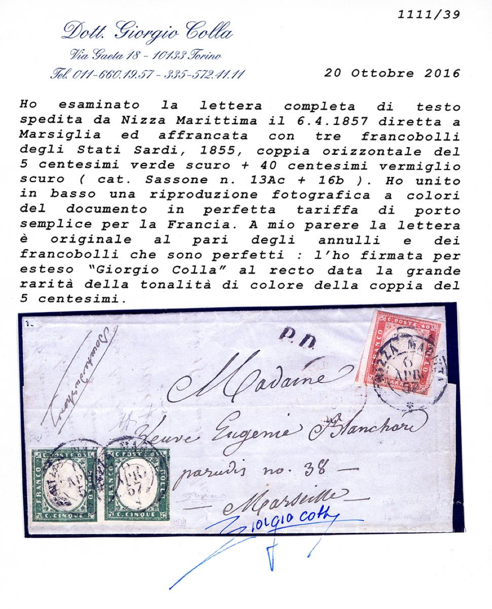 1857 - 5 cent. verde scuro, coppia orizzontale, 40 cent. vermiglio scuro (13Ac,16b), perfetti, su lettera da Nizza Marittima 6/4/1857 a Marsiglia. Multiplo estremamente raro di questa pregiata tonalità del 5 cent. Per specialista. A.Diena, Fiecchi, cert. Colla.