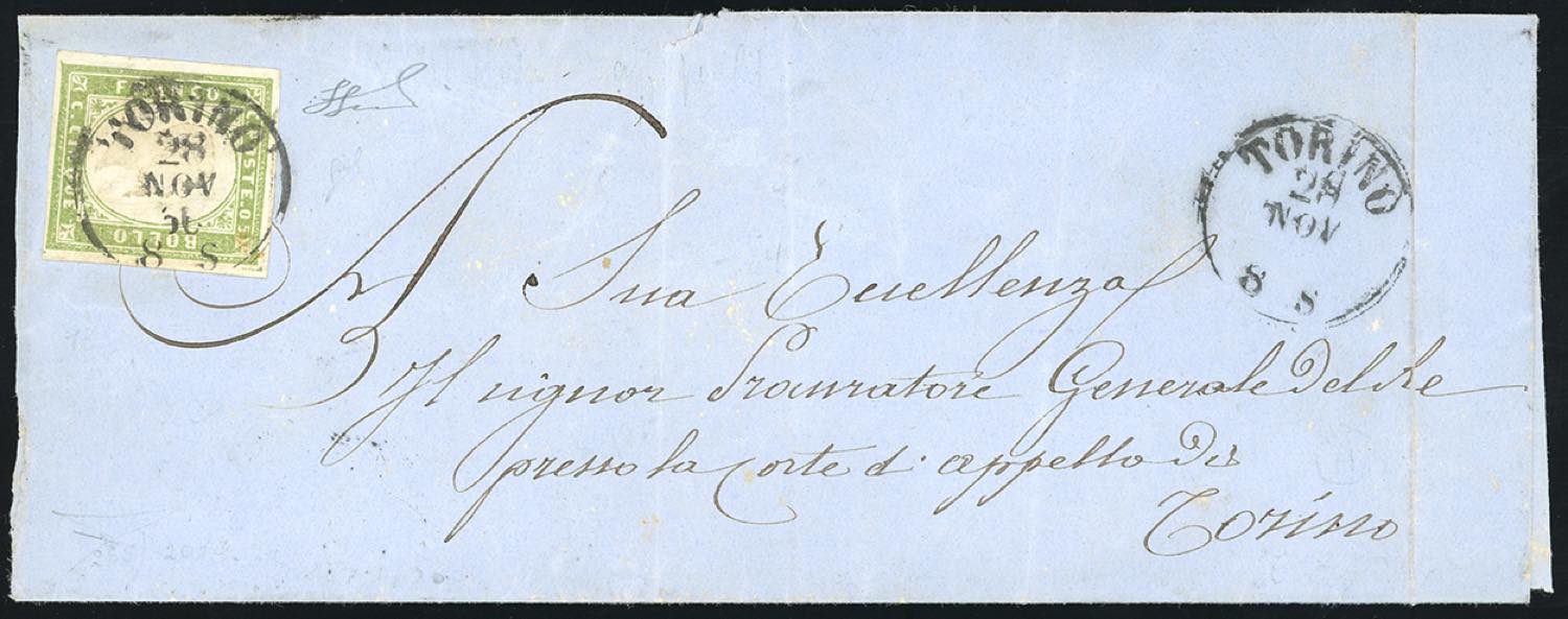 1860 - 5 cent. verde oliva (13Bc), perfetto, isolato su sovracoperta di lettera da Torino 28/11/1860 per città.