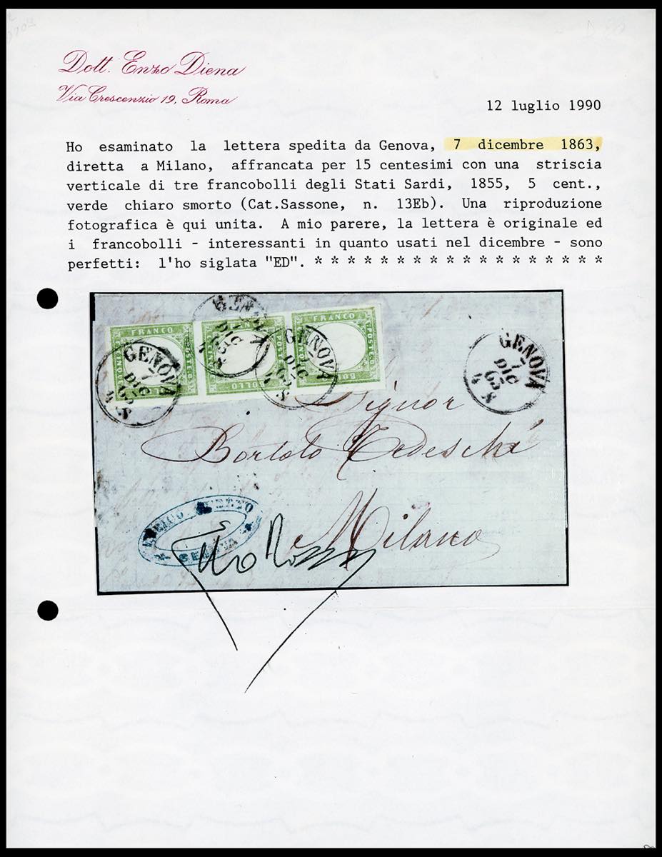1863 - 5 cent. verde chiaro smorto, striscia verticale di tre (13Eb), perfetta, su lettera da Genova 7/12/1863 a Milano. Pregevole affrancatura nel dicembre 1863. Cert. E.Diena.