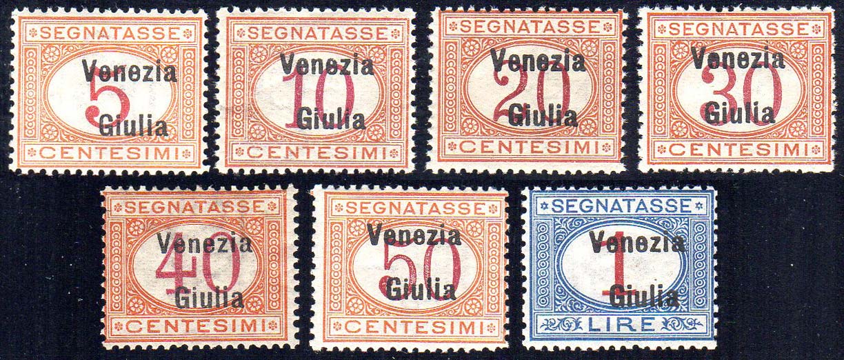 VENEZIA GIULIA SEGNATASSE 1918 - Soprastampati (1/7), gomma integra, perfetti. Alti valori firmati Zanaria.