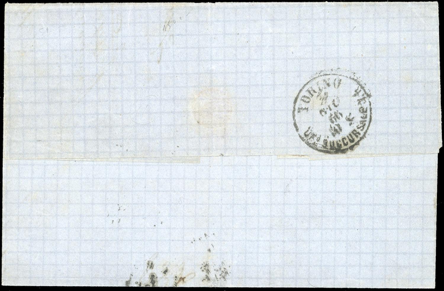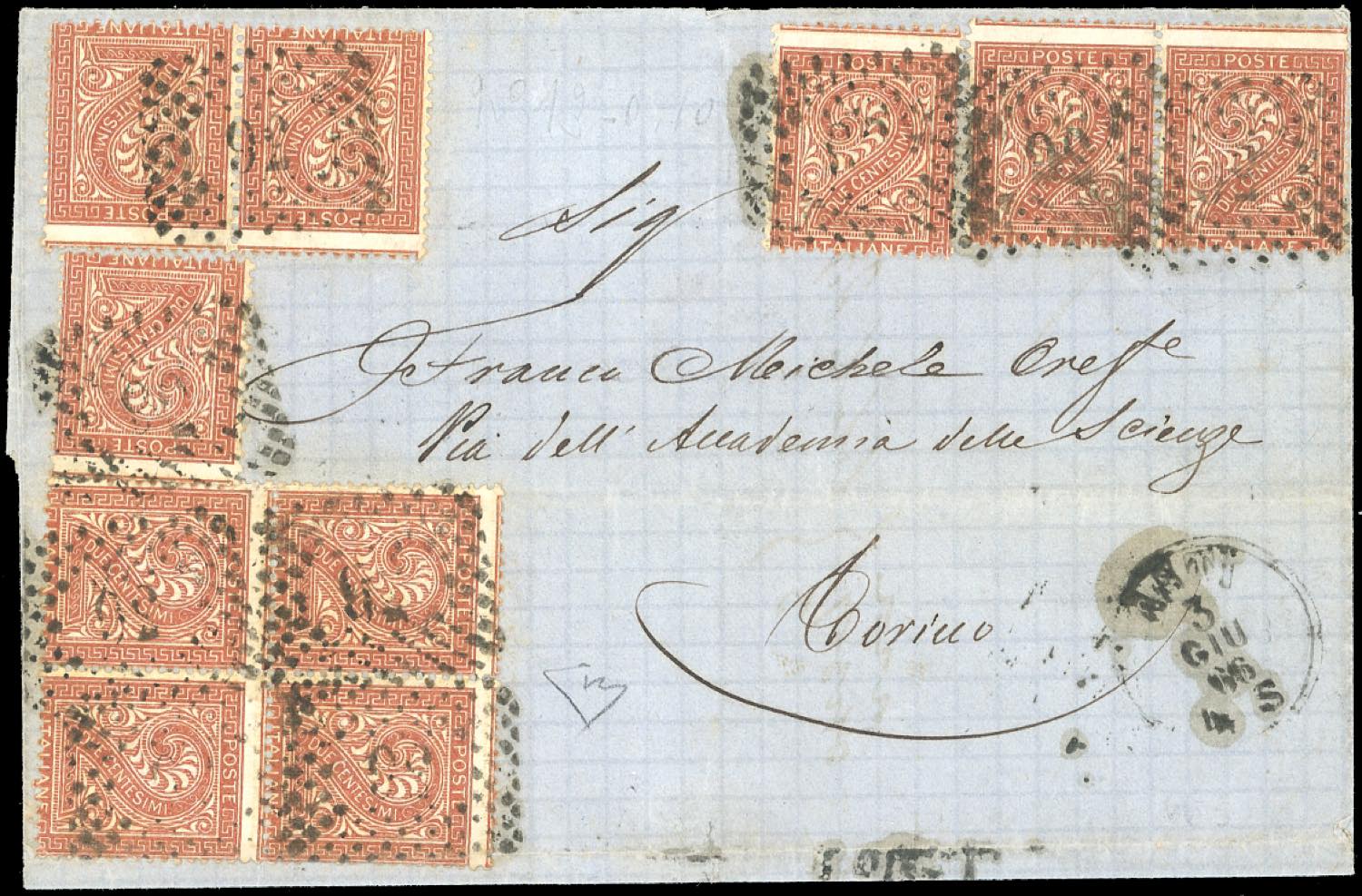1866 - 2 cent. De la Rue, tiratura di Londra (L15), blocco di quattro, lieve piega su un valore, striscia di tre, coppia e singolo, perfetti, su lettera da Asti 3/6/1866 a Torino. Molto rara! Cert. Diena.