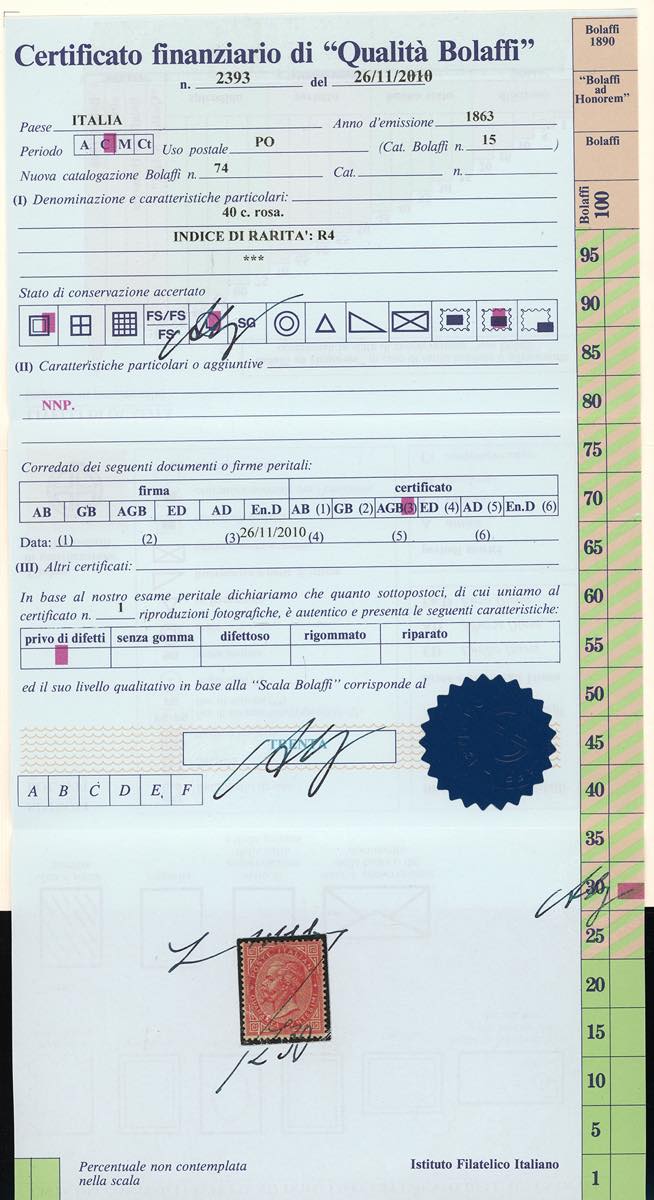 1863 - 40 cent. De La Rue, tiratura di Londra (L20), buona centratura, gomma originale, perfetto. Molto fresco. E.Diena, cert. Finanziario Bolaffi.