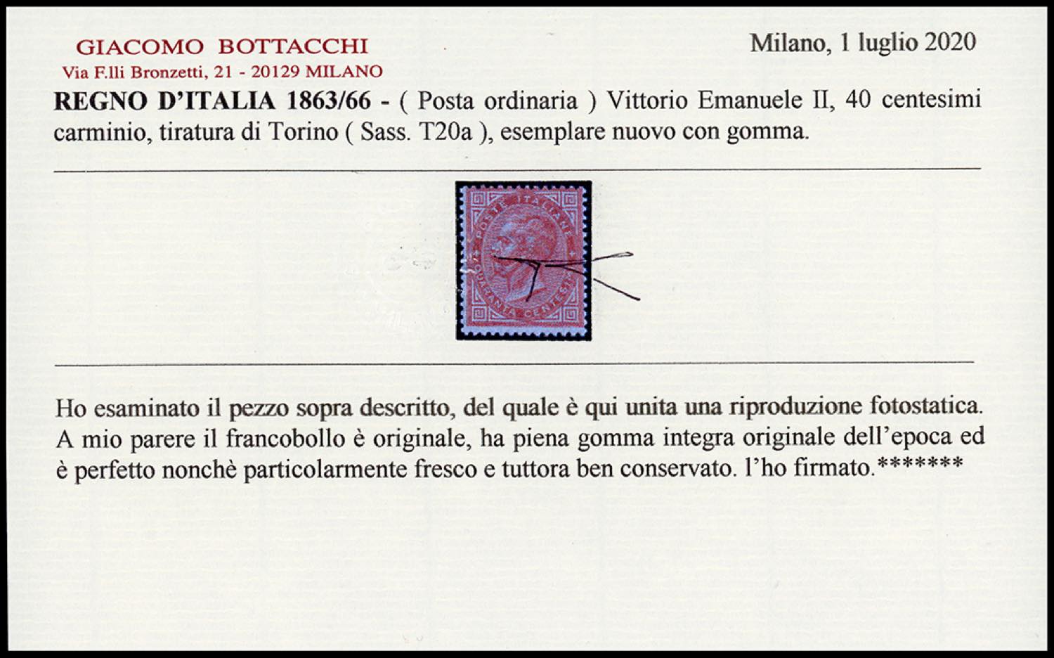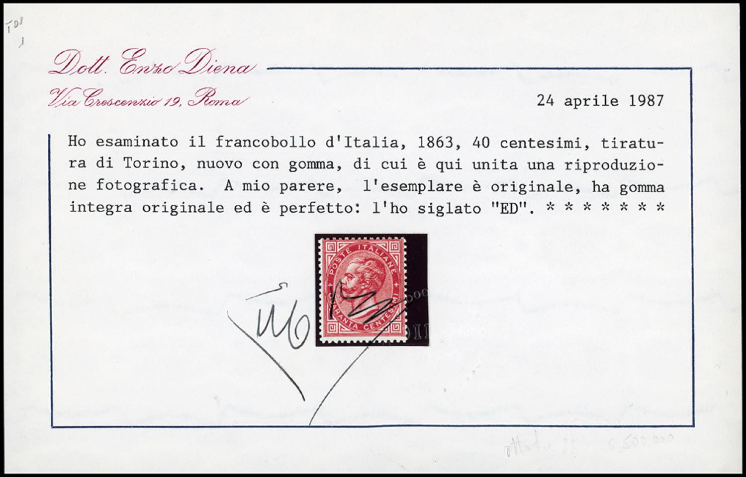 1866 - 40 cent. De La Rue, tiratura di Torino (T20), nuovo, gomma originale integra, perfetto. Molto fresco. A.Diena, cert. E.Diena e ... Read more