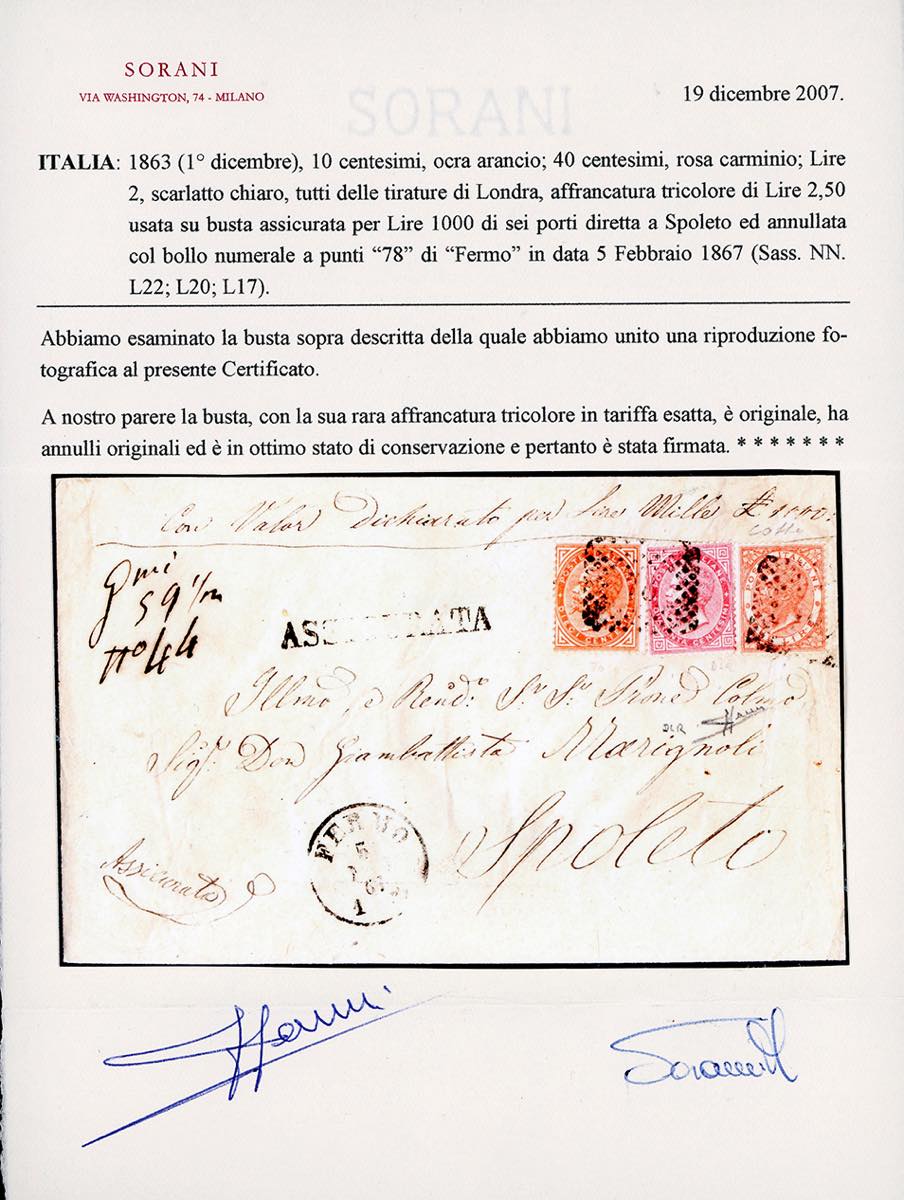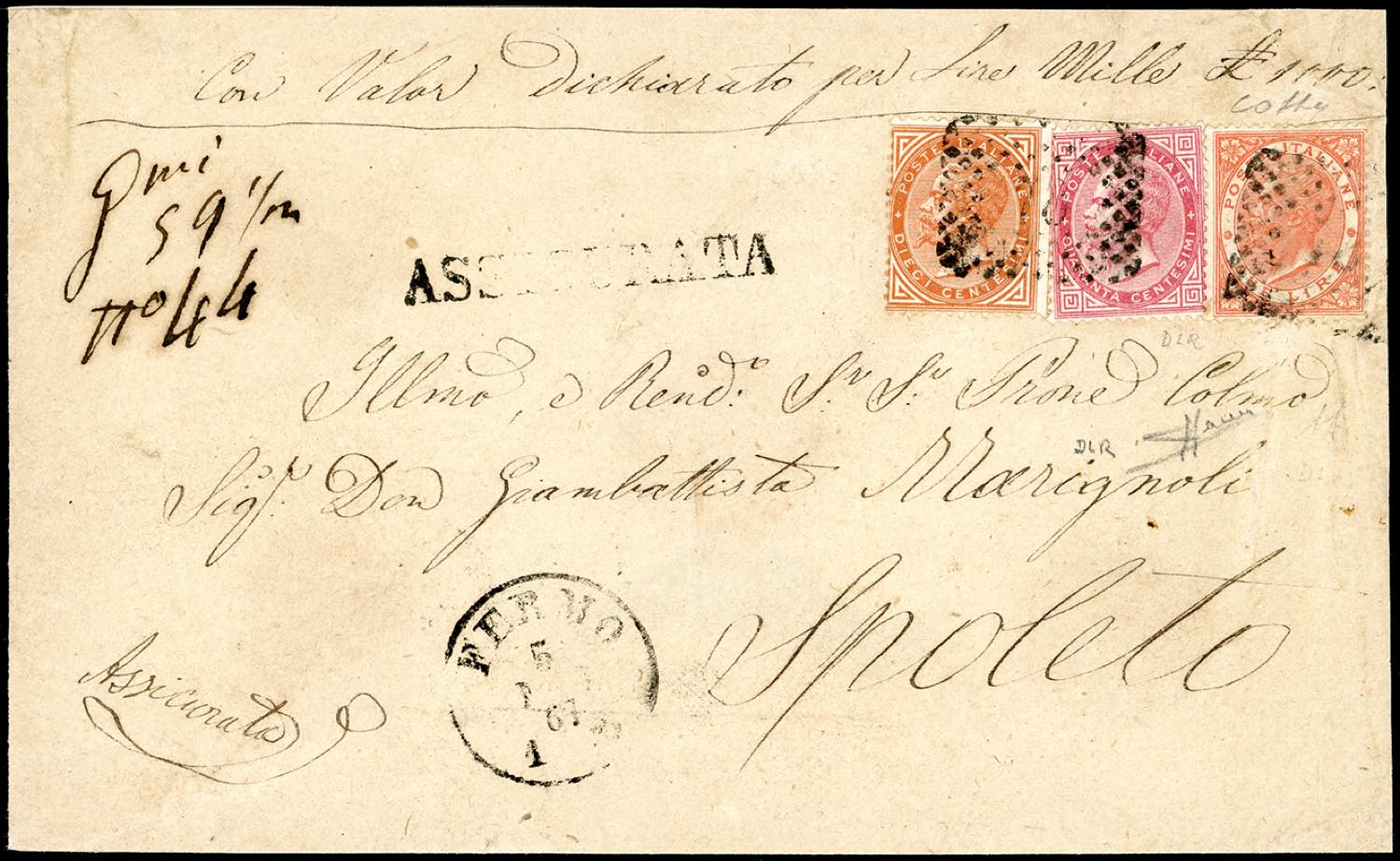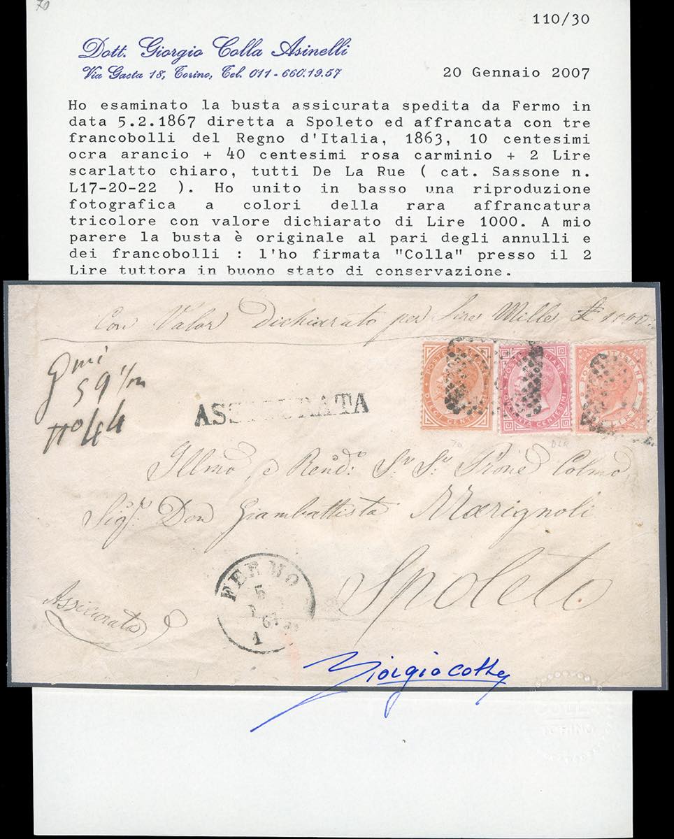 1867 - 2 lire, 10 cent., 40 cent. De La Rue, tiratura di Londra (L22,L17,L20), leggerissima grinza diagonale sull'alto valore, su busta di sei porti assicurata per 1.000 lire da Fermo 5/2/1867 a Spoleto. Rara e di ottimo aspetto. Cert. Colla e Sorani.