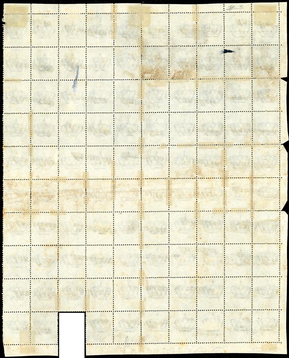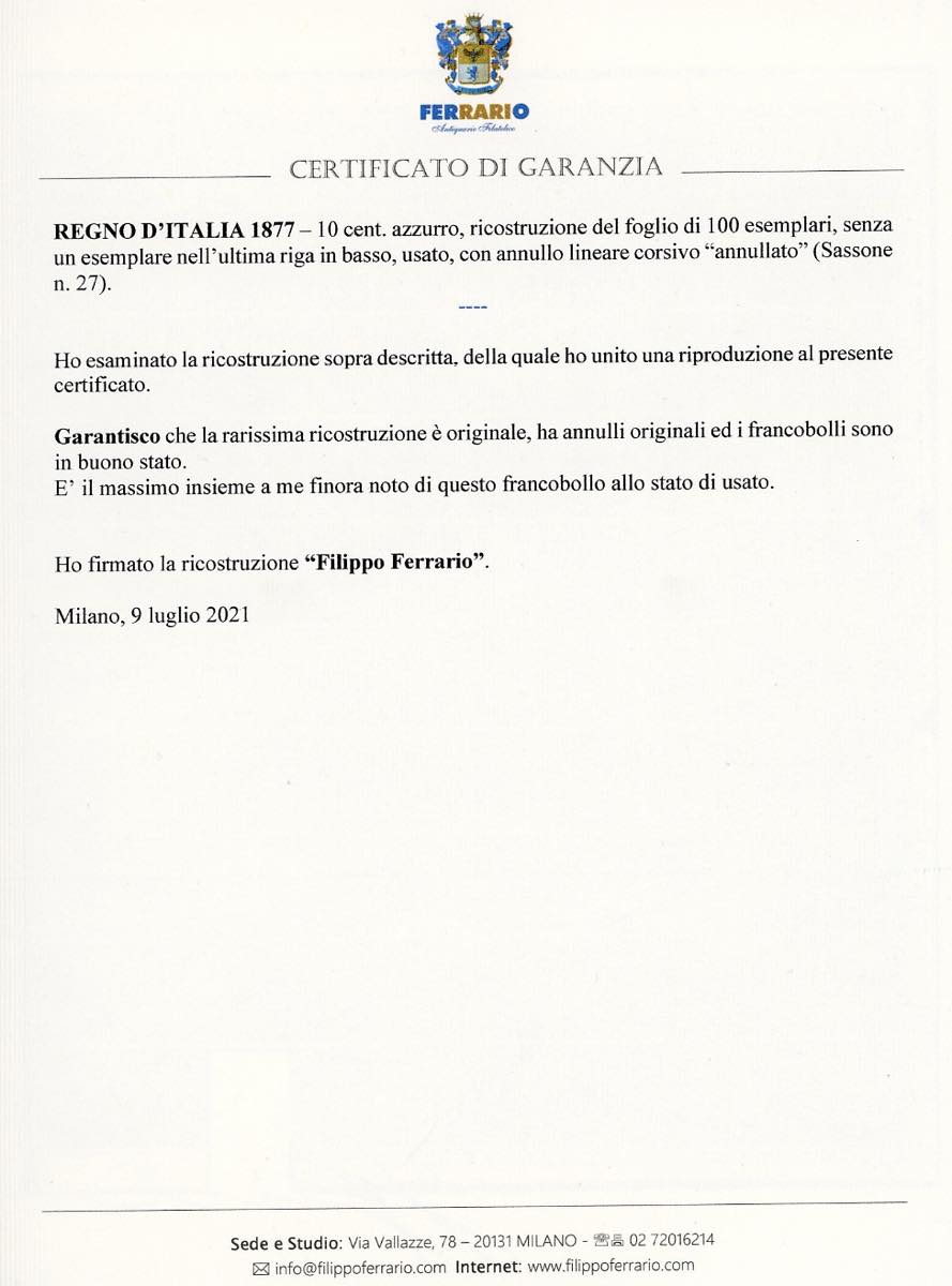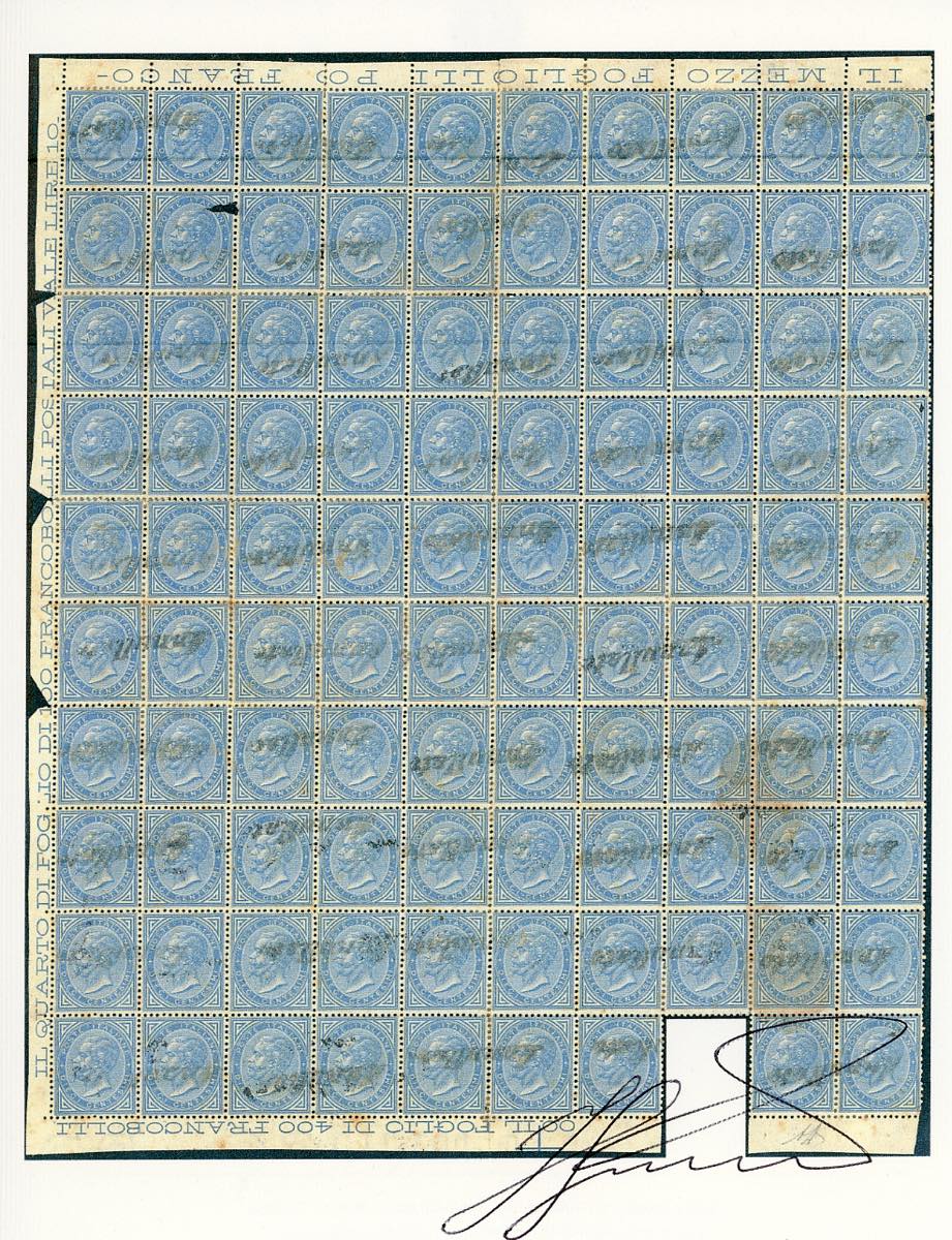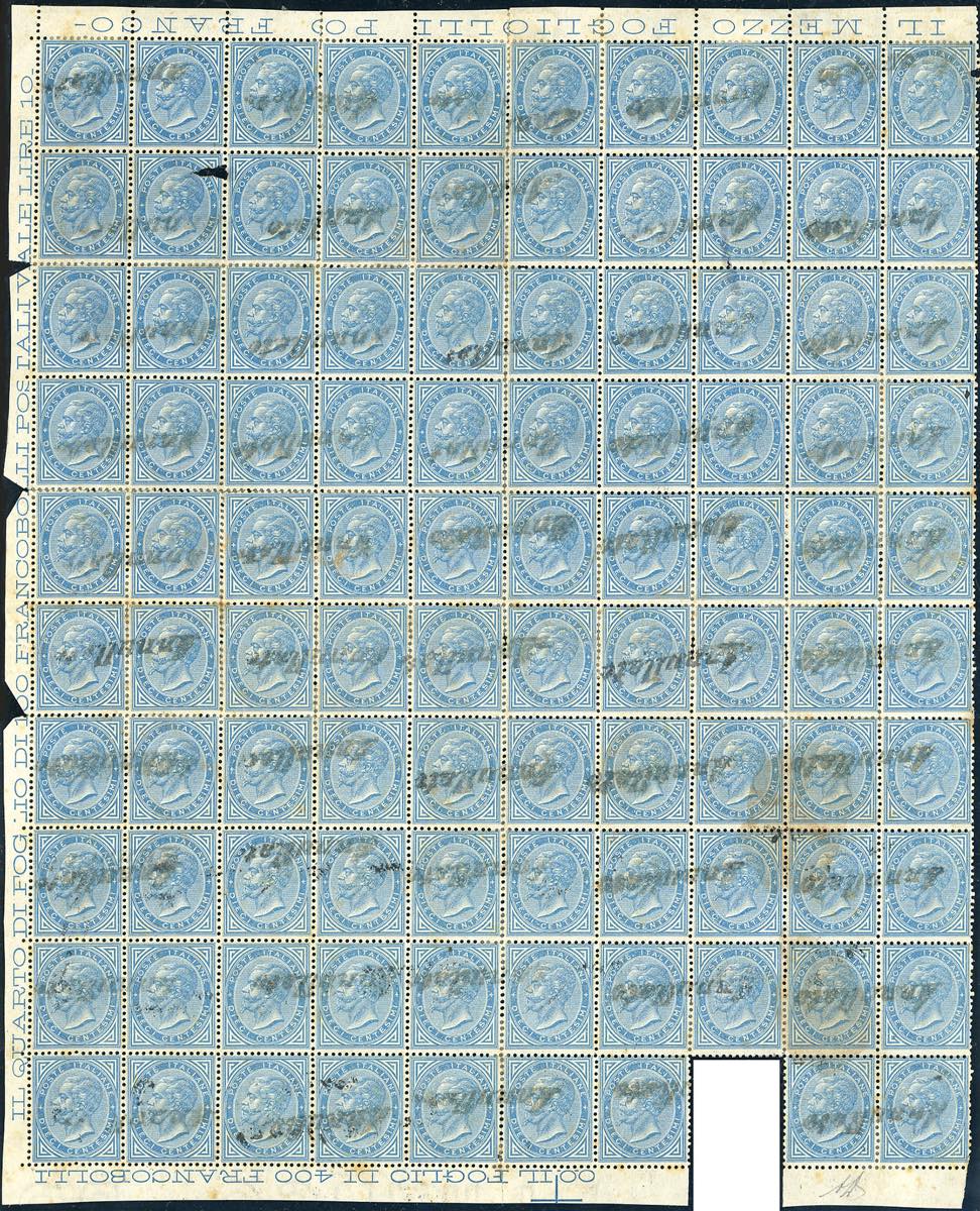 1877 - 10 cent. azzurro (27), foglio quasi completo, manca solo un esemplare, usato con il lineare corsivo "annullato". INSIEME UNICO E DI ECCEZIONALE RARITA'. Da esposizione. A.Diena, cert. Ferrario.
