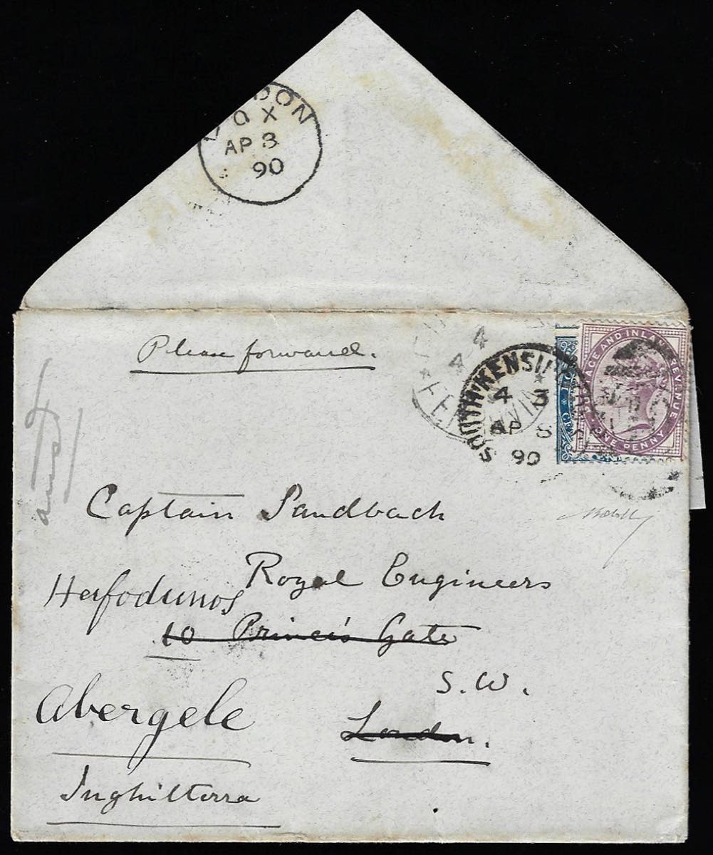 1890 - 25 cent. Umberto I (40), su busta da Firenze 4/4/1890 a Londra, rispedita a Abergela previa riaffrancatura con 1 p. Regina Vittoria, ... Read more