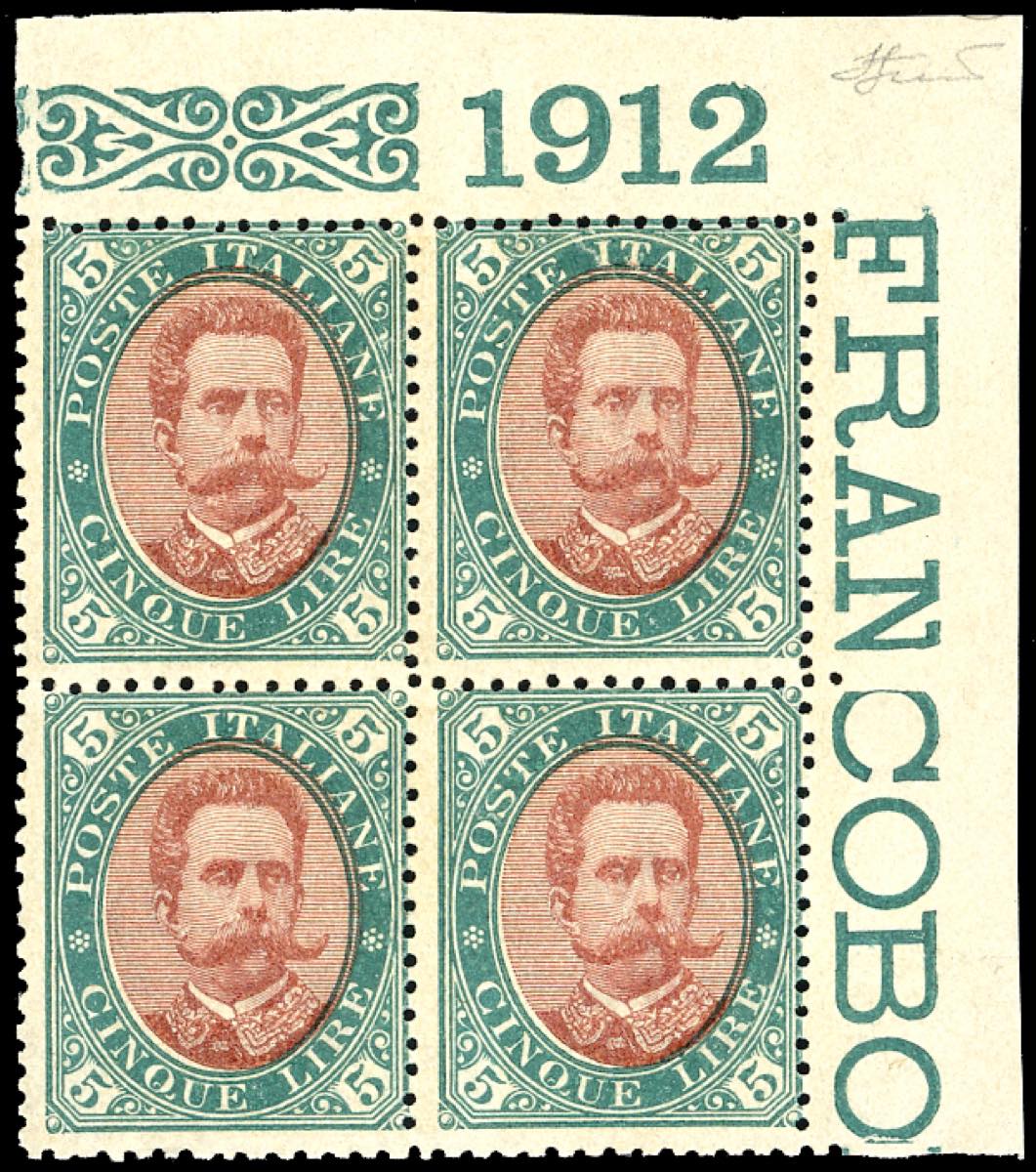 1889 - 5 lire verde e carminio Umberto I (49), blocco di quattro angolo di foglio superiore destro con numero di tavola 1912, nuovo, gomma originale integra, perfetto. Molto bello e non comune. Cert. Ferrario.
