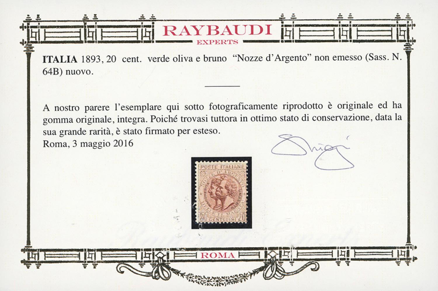 1893 - 20 cent. verde oliva e bruno, Nozze d'argento di Umberto I, non emesso (64B), gomma originale integra, perfetto. Raro e molto fresco. Cert. Oro Raybaudi.