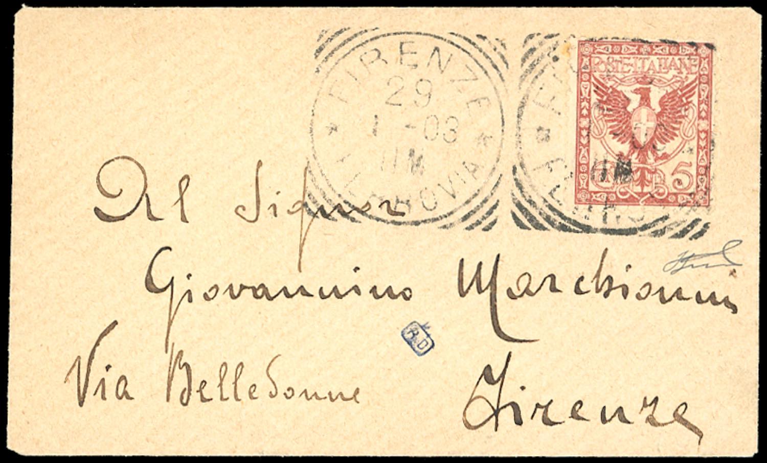 1908 - 5 cent. rosso bruno Floreale, errore di colore (70C), perfetto, isolato su busta da Firenze 29/1/1908 per città. Non comune. ... Read more