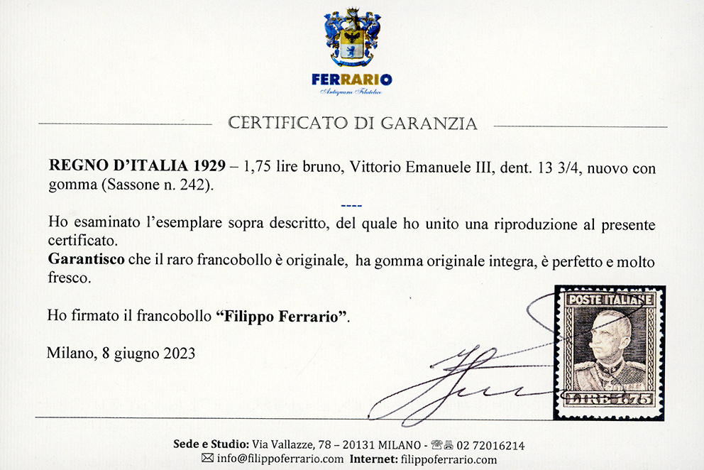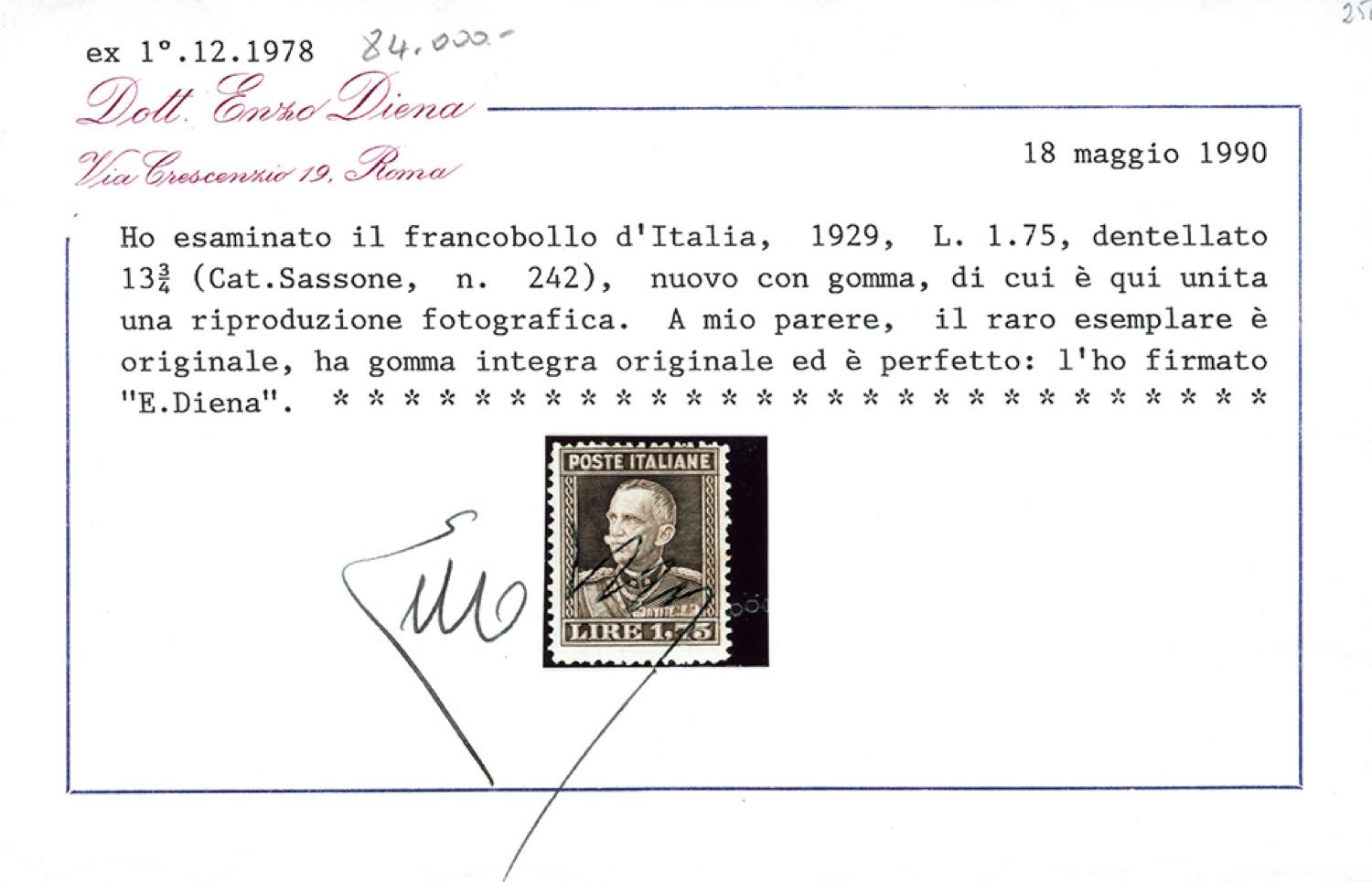 1929 - 1,75 lire bruno, Vittorio Emanuele III, dent. 13 3/4 (242), nuovo, gomma originale integra, perfetto. Freschissimo e molto raro. A.Diena, Luigi Sirotti, Luigi Raybaudi, G.Oliva, cert. Ferrario ed Enzo Diena 1990.