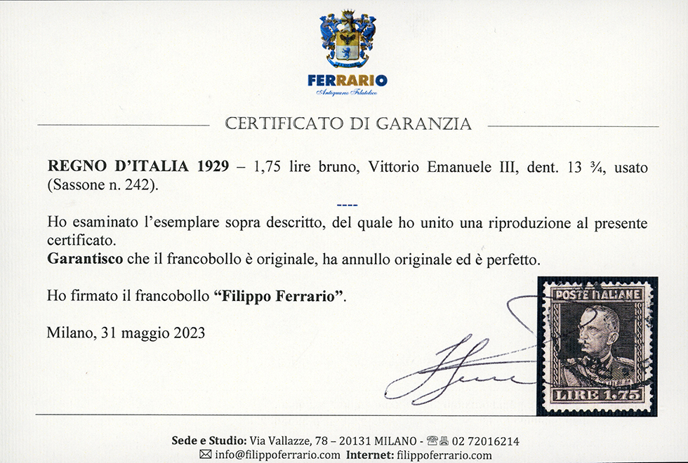 1929 - 1,75 lire bruno, Vittorio Emanuele III, dent. 13 3/4 (242), usato, perfetto. Fresco e ben centrato. Cert. Ferrario.