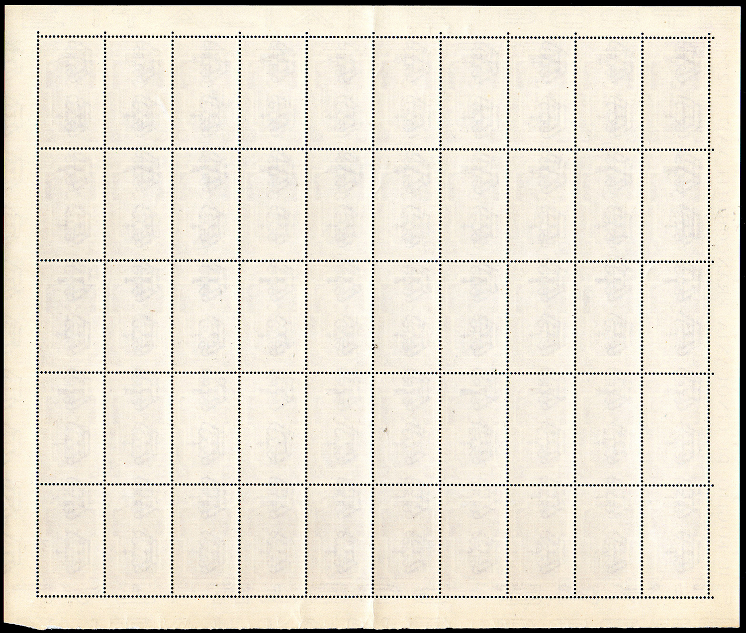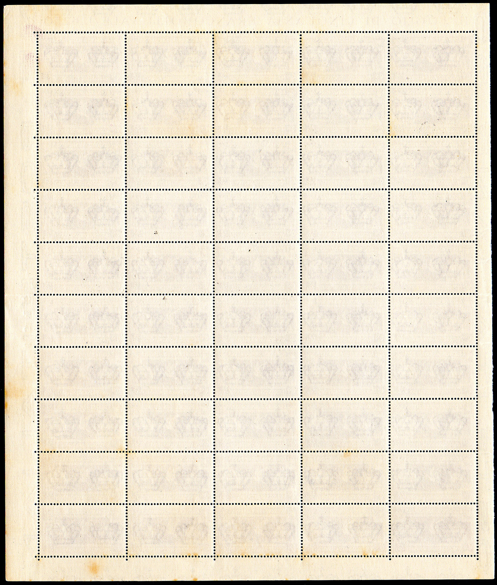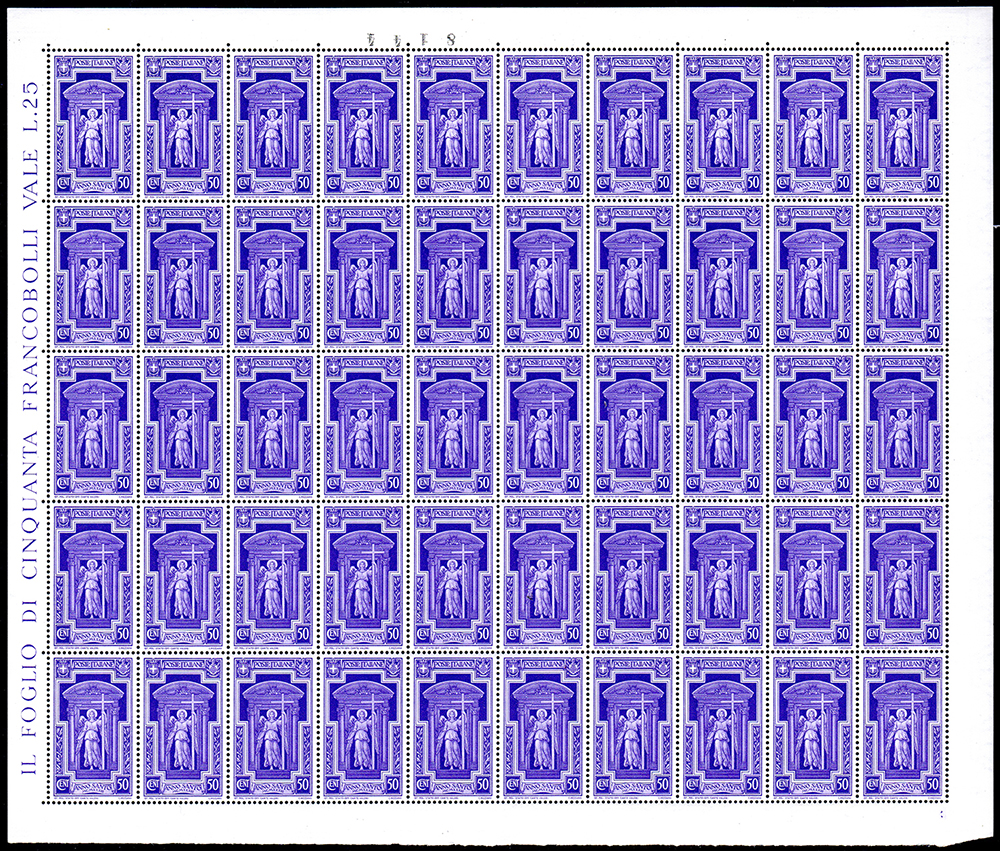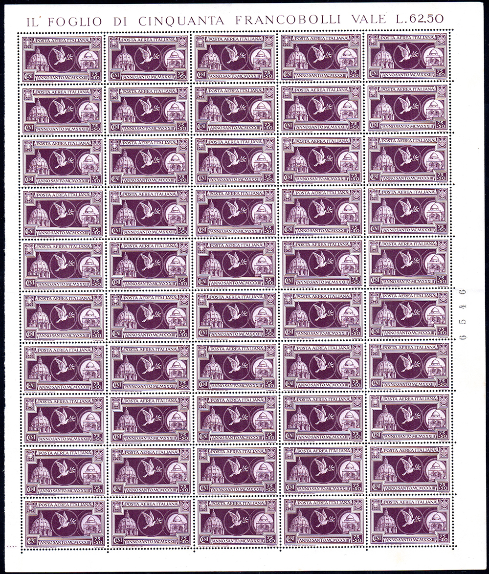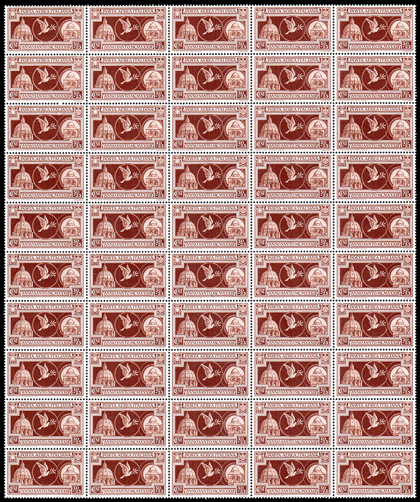 1933 - Anno Santo, serie completa (345/349+A), fogli completi di 50 esemplari, gomma originale integra, perfetti, lievi ossidazioni su alcuni francobolli di posta aerea. Rari.