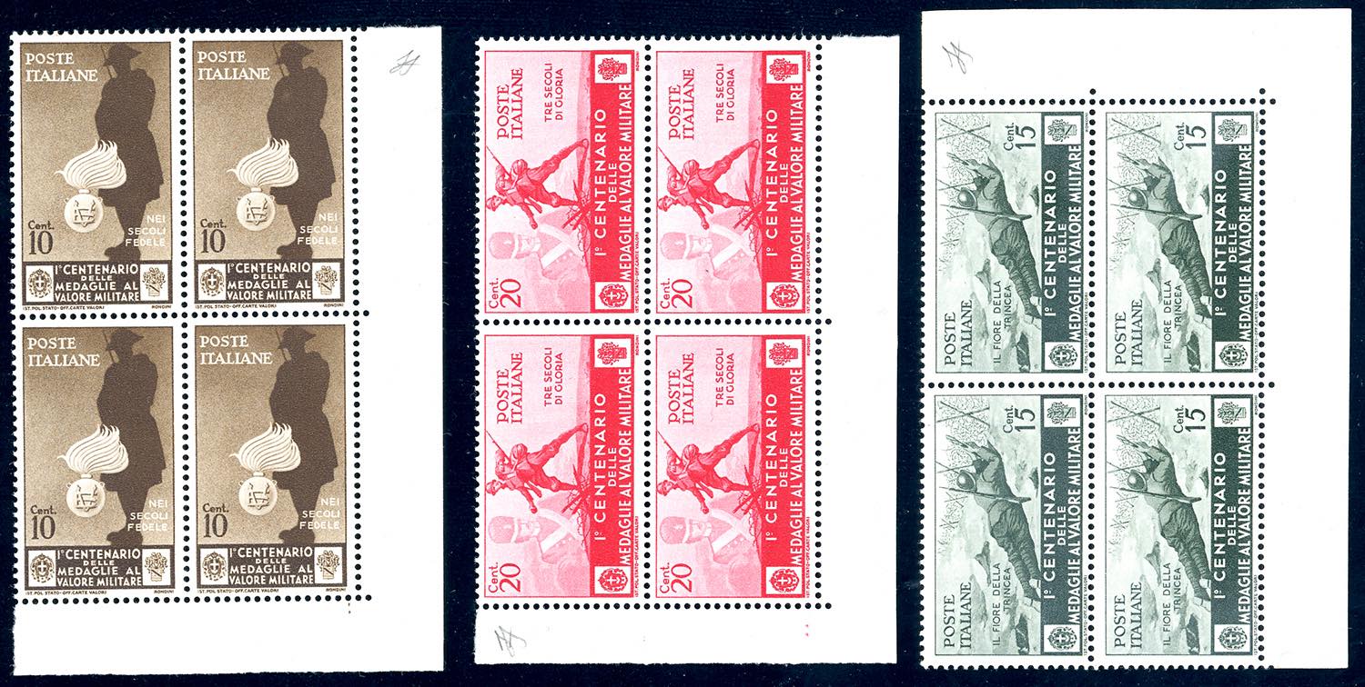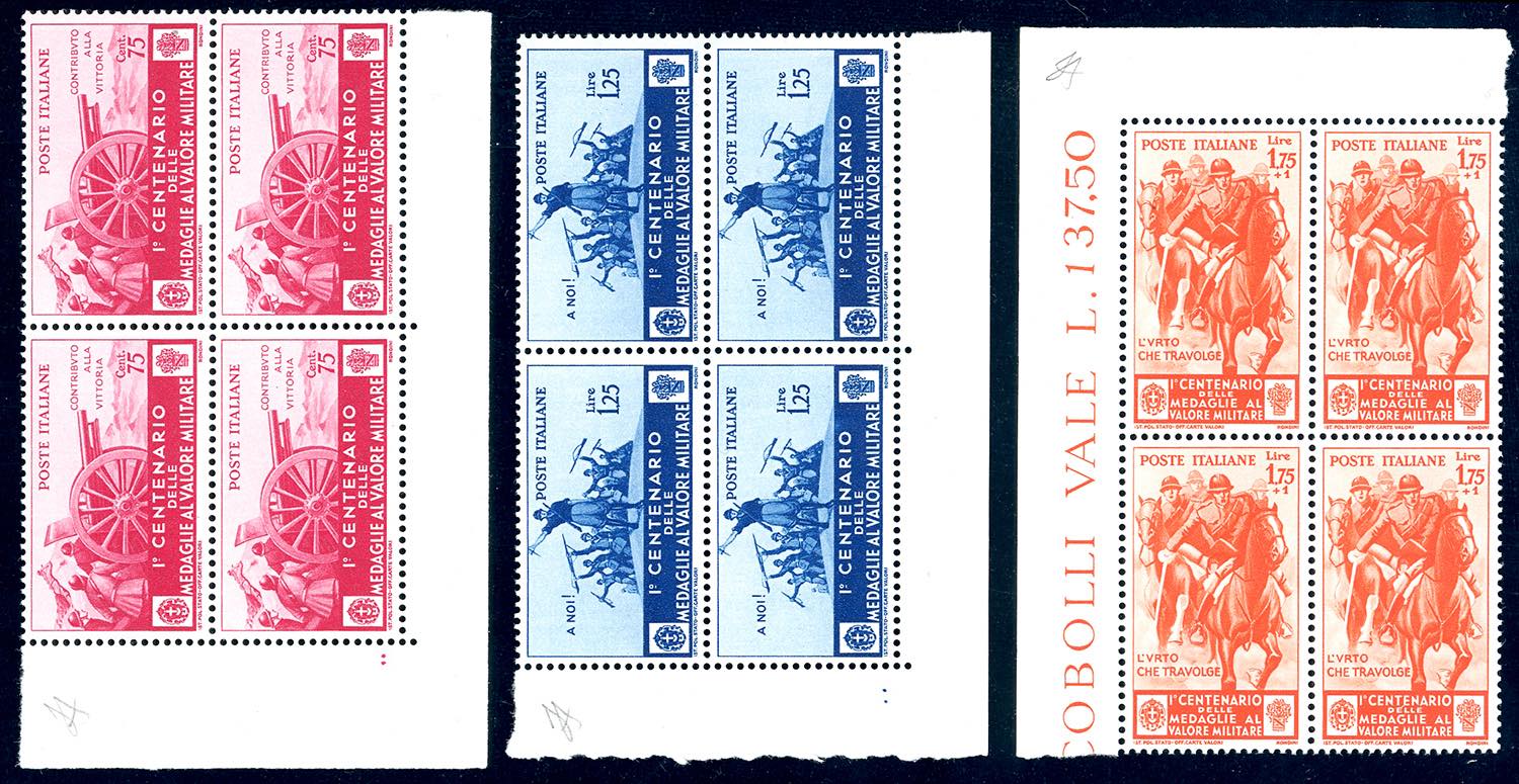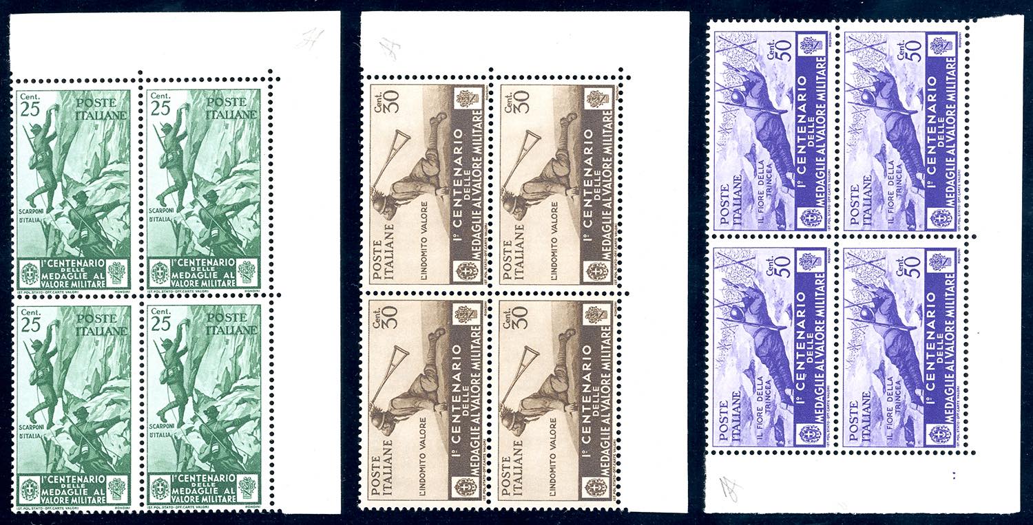 1934 - Medaglie al valore, serie completa di posta ordinaria (368/376), blocchi di quattro, angolo di foglio, nuovi, gomma originale integra, perfetti. Splendidi, qualità lusso. Ferrario.