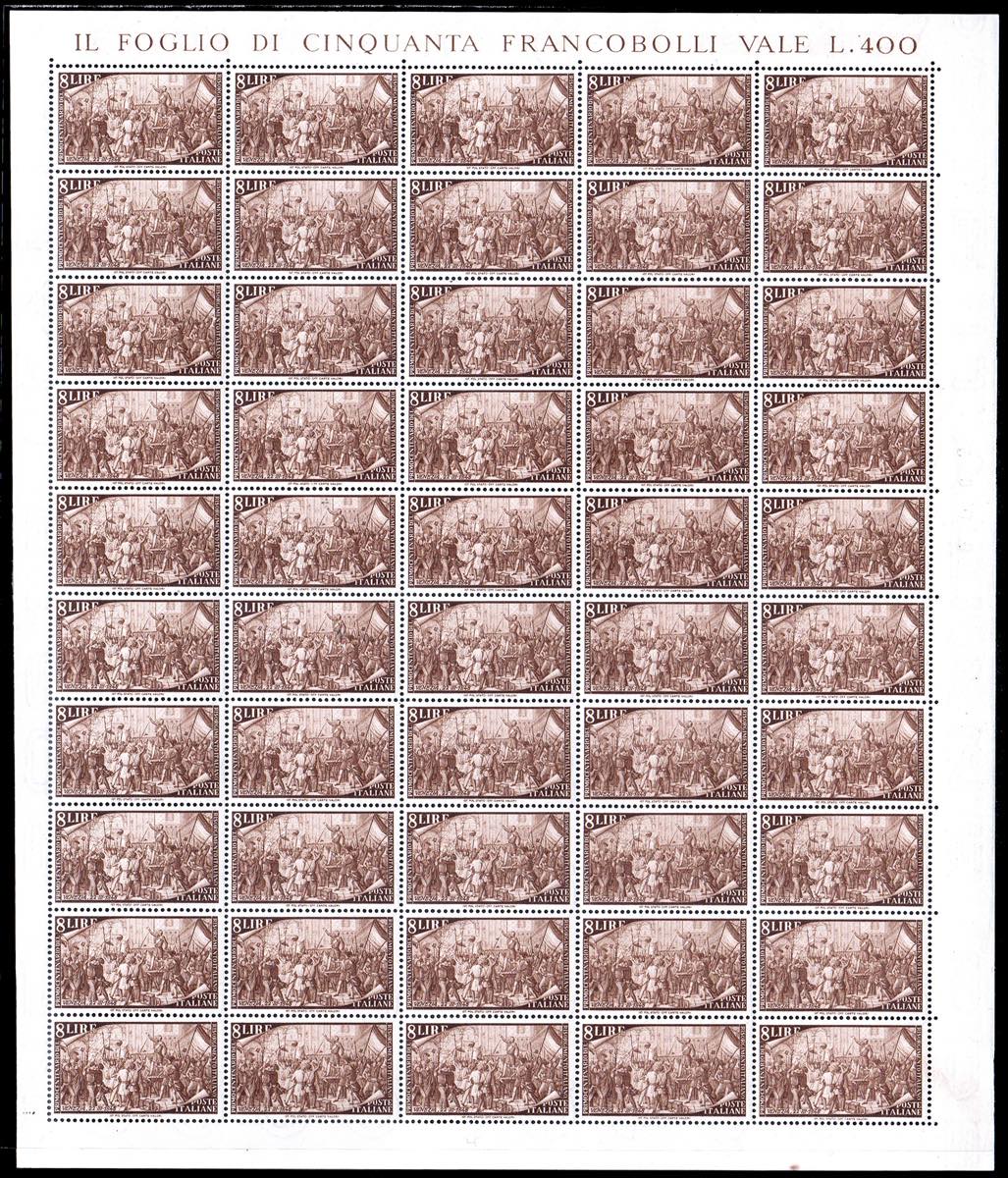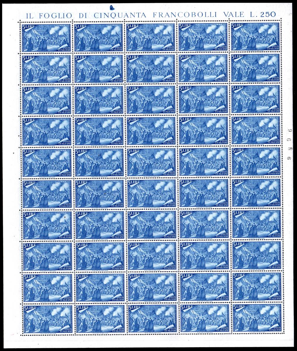 1948 - Risorgimento, serie completa (580/591+E), fogli completi di 50 esemplari, gomma originale integra, perfetti e molto freschi. Splendido e raro insieme. Cert. Finanziario Bolaffi 100%.