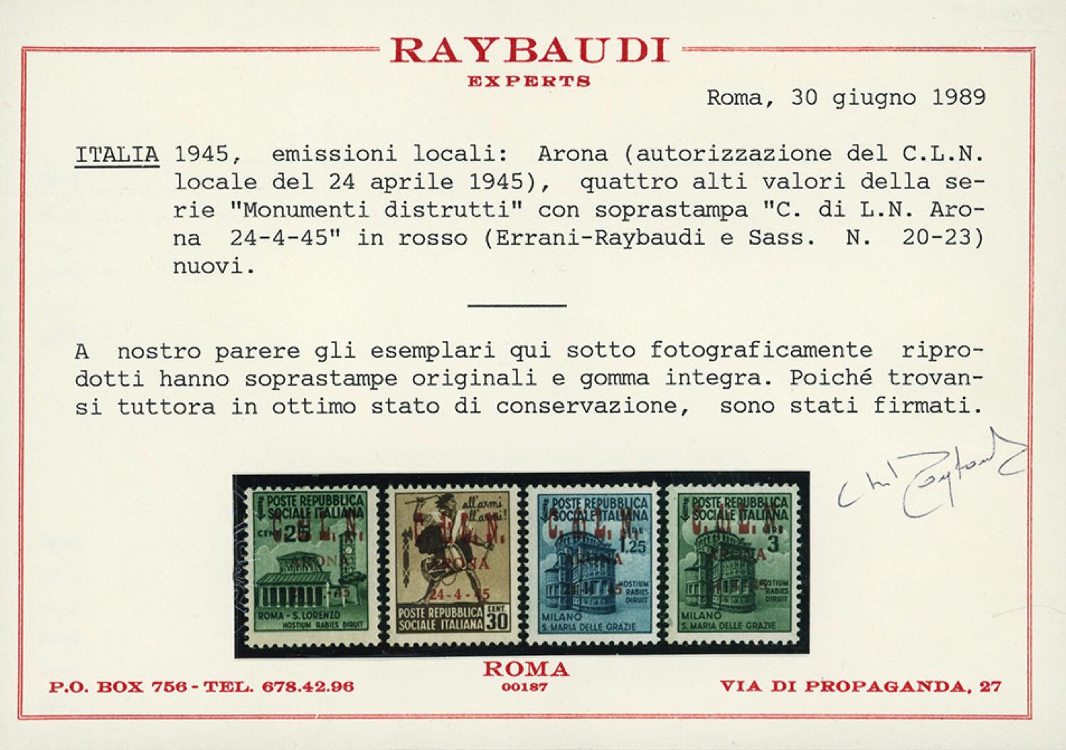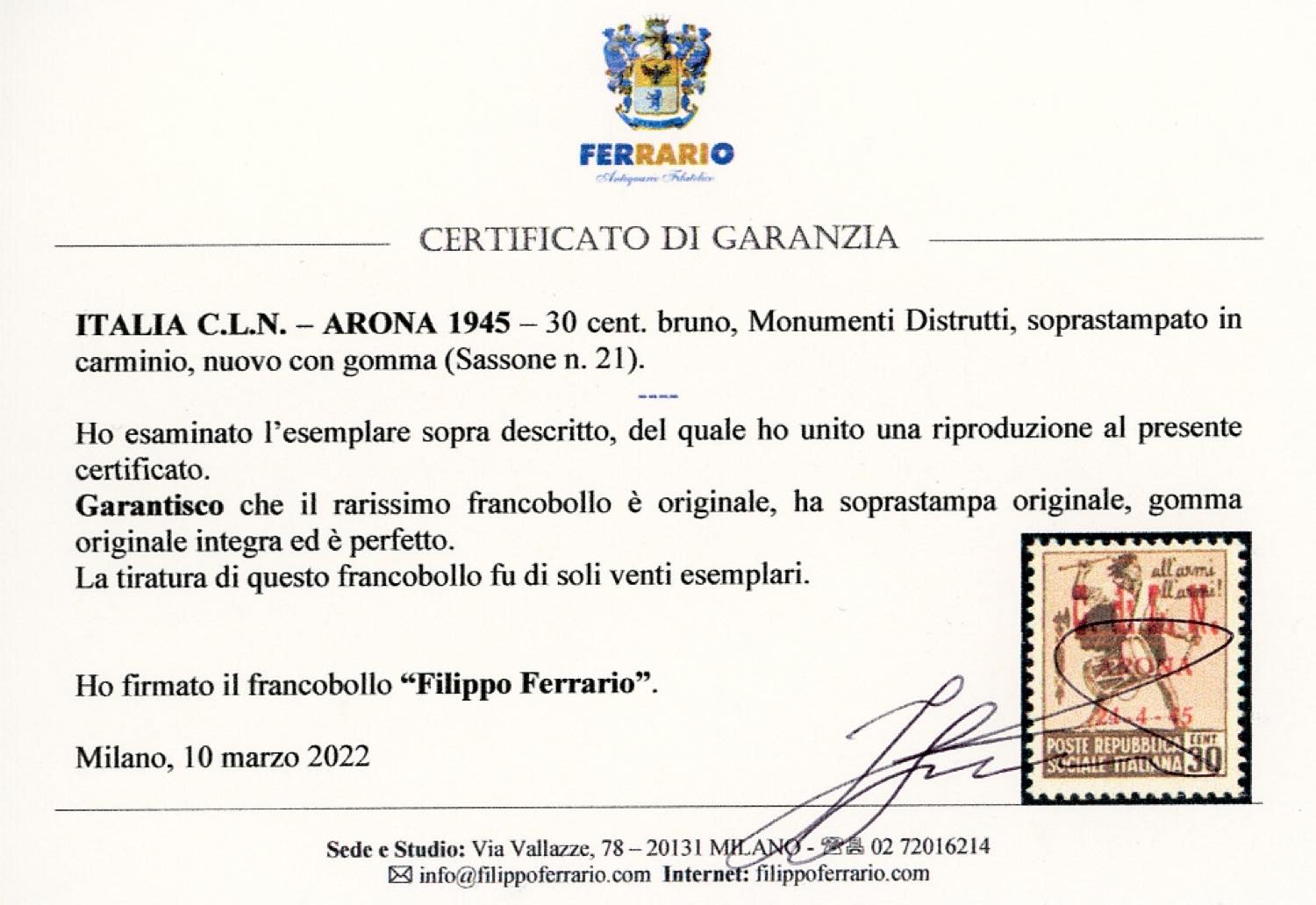 ARONA 1945 - 30 cent. soprastampato in carminio (21), gomma originale integra, perfetto. Rarissimo, tiratura 20 esemplari. Cert. Raybaudi, ... Read more