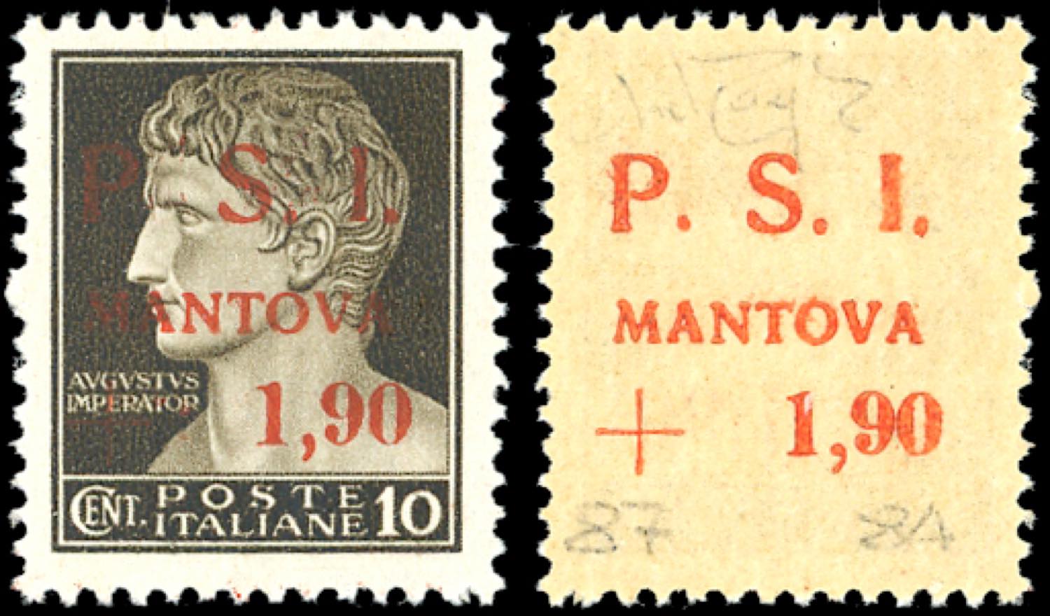 MANTOVA 1945 - 1,90 lire su 10 cent., soprastampa recto-verso, senza punto dopo la "P" al recto e punto piccolo dopo la "P" al verso ... Read more
