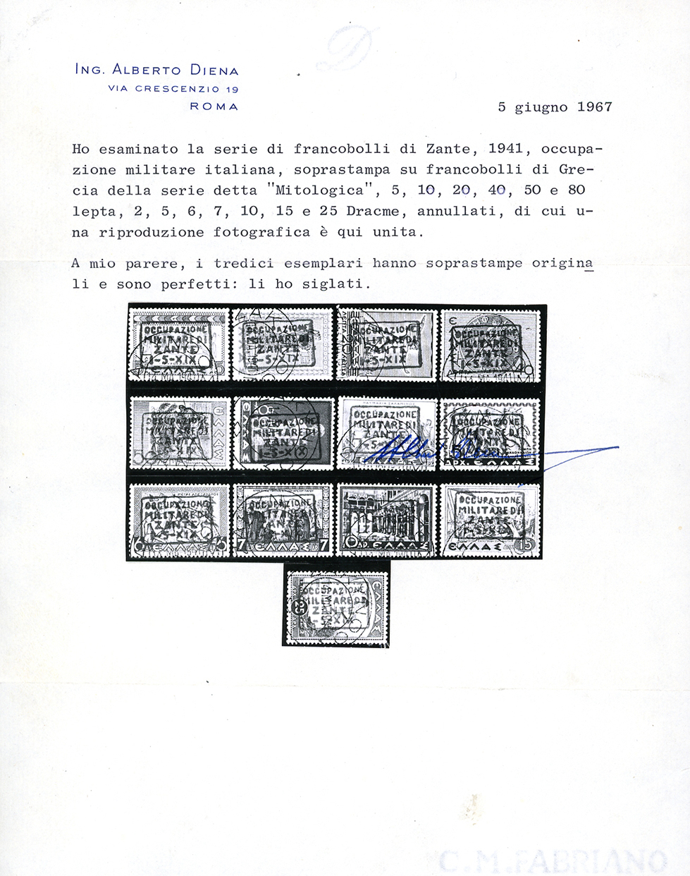 ZANTE 1941 - Mitologica soprastampata, il 10 lepta con varietà "TYPI" (5,6A,7/17), usati, perfetti. Cert. A.Diena.