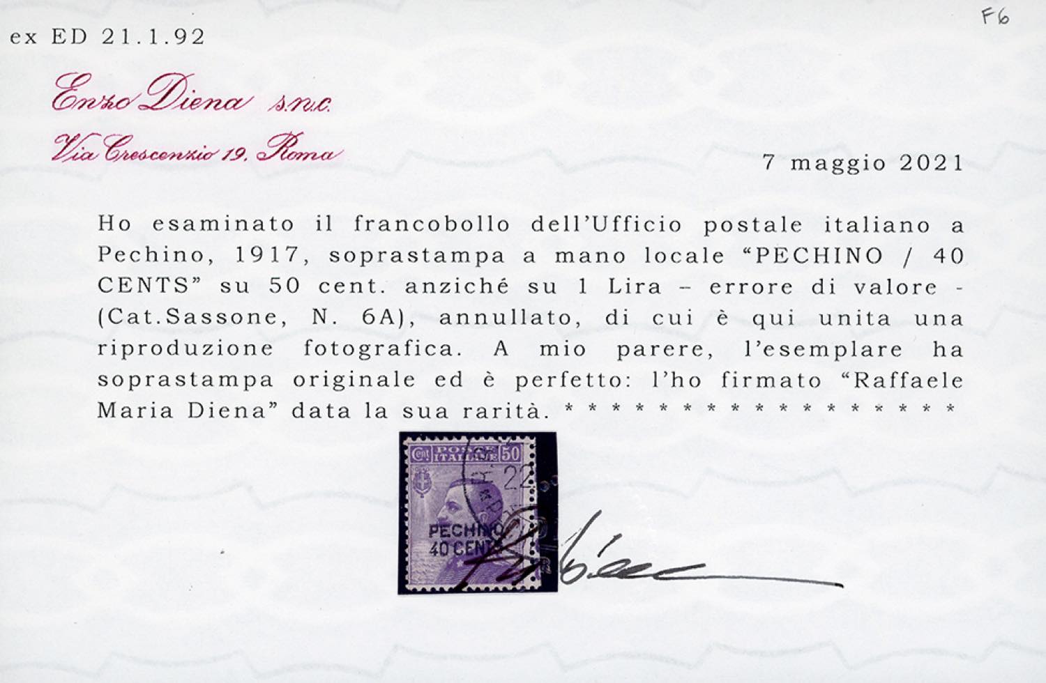 PECHINO 1917 - 40 cent. su 50 cent., errore di valore (6A), usato, perfetto. Molto raro e di ottima qualità. E.Diena, cert. Diena e Ferrario.