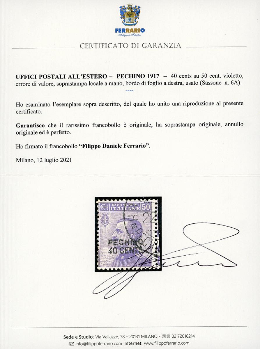 Lot 1625 - PECHINO 1917 - 40 cent. su 50 cent., errore di valore (6A), ...