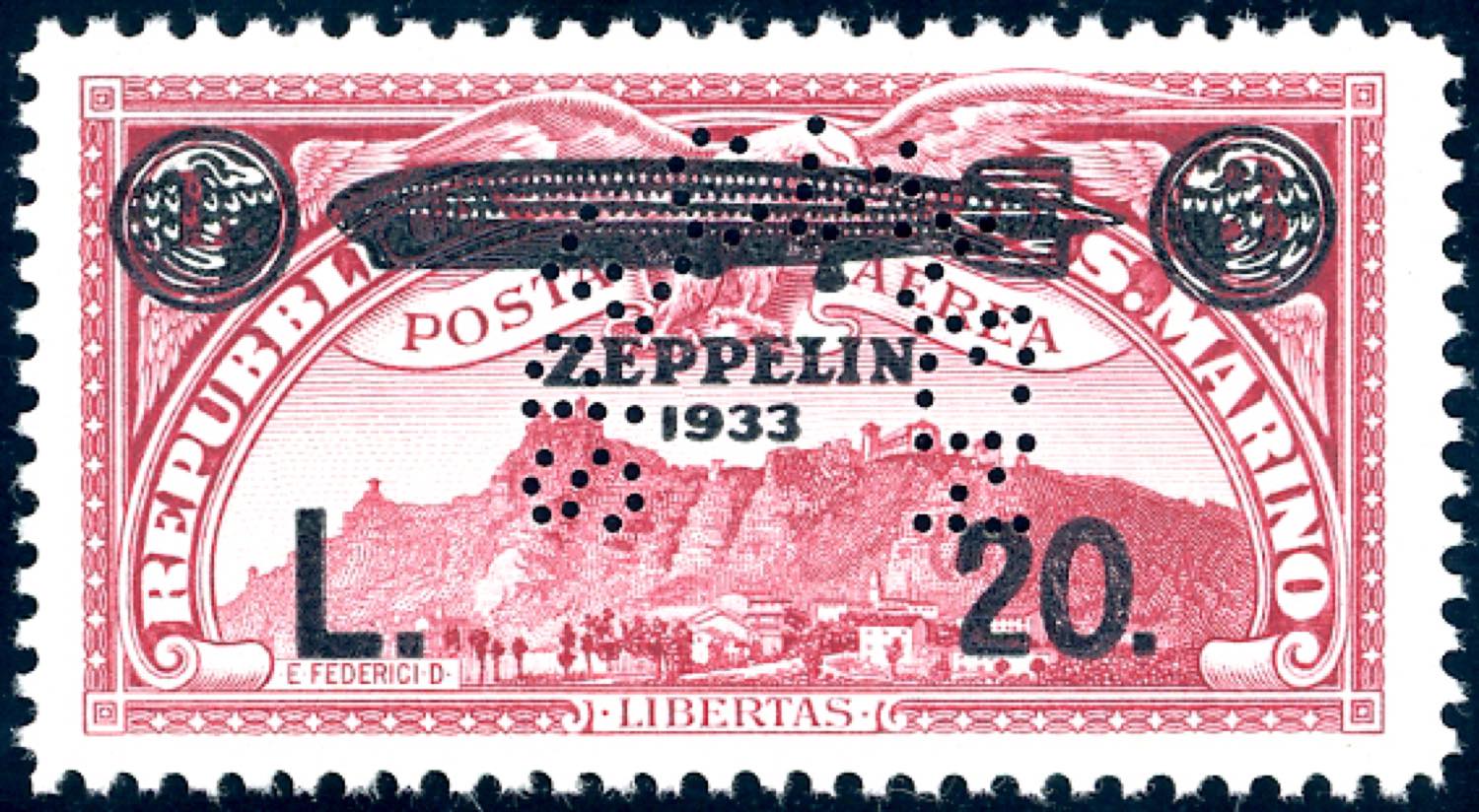 1933 - 20 lire su 3 lire carminio Crociera Zeppelin, SAGGIO, in colore cambiato, perforato SPECIMEN (P16), gomma originale integra, ... Read more