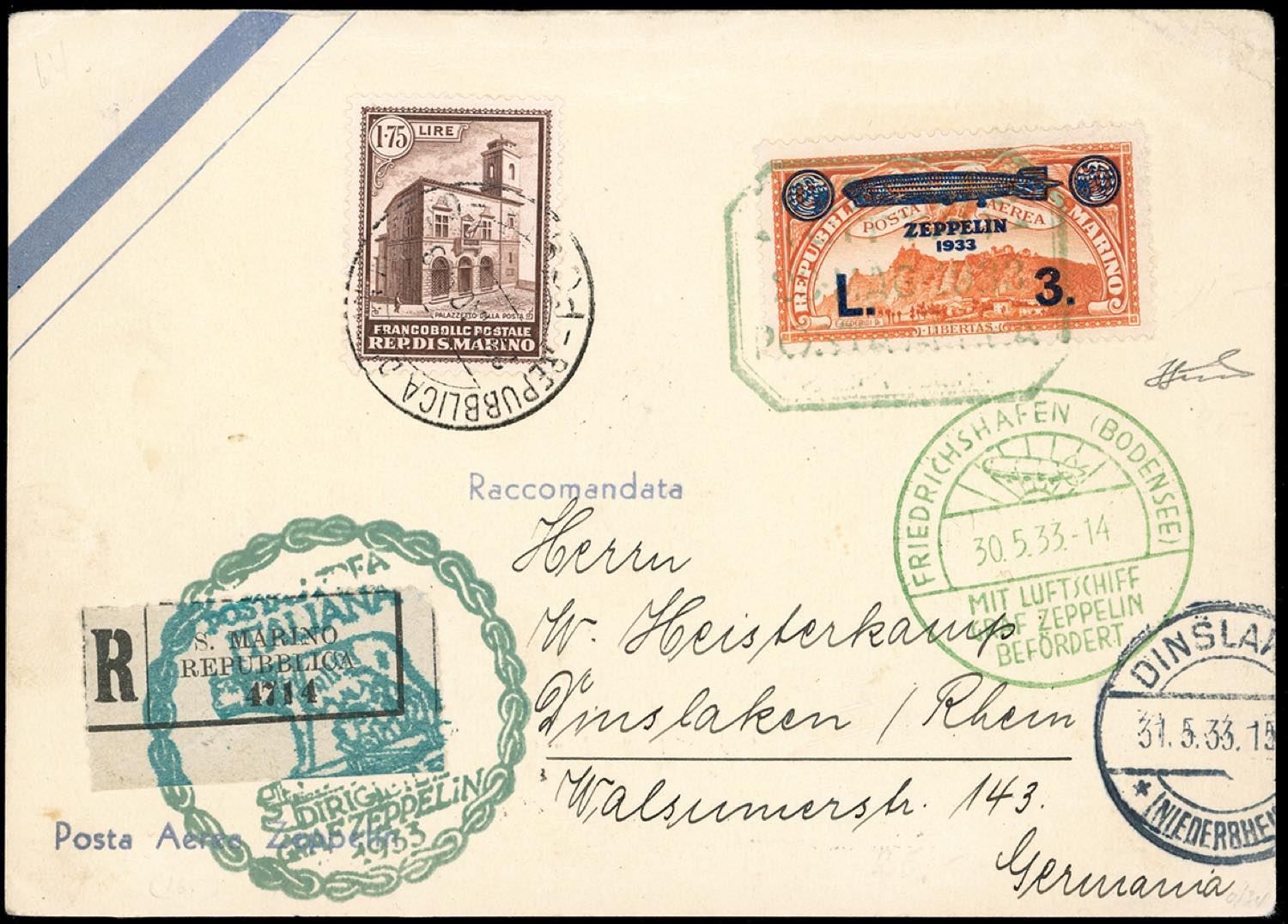 1933 - 3 lire su 50 cent. Zeppelin, 1,75 lire Palazzetto della Posta (A11,162), perfetti, su cartolina raccomandata per via aerea da San Marino 23/5/1933 per la Germania, bolli speciali della Crociera sul fronte e al verso. Ferrario.