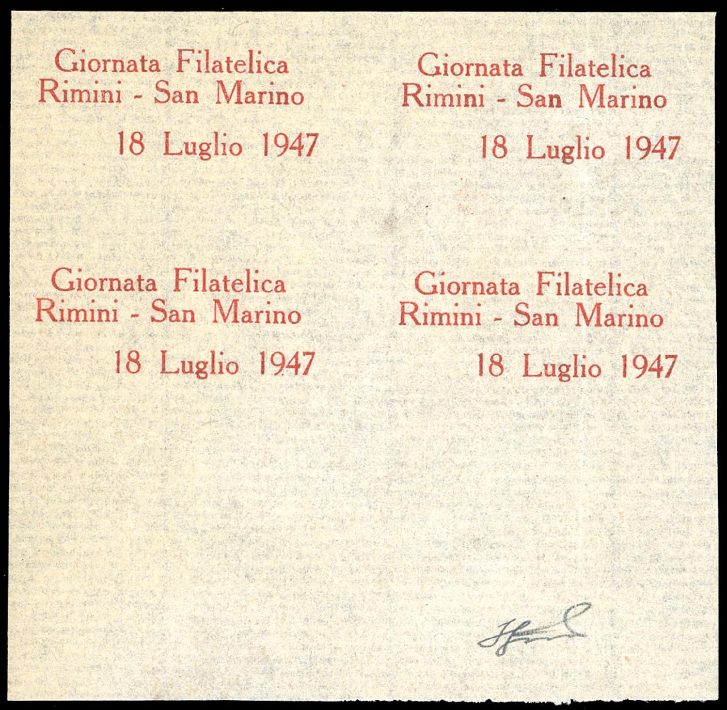1947 - Giornata Filatelica Rimini - San Marino (72), prova della soprastampa su carta crema sottile, blocco di quattro, senza gomma come sempre, perfetto. Non comune. Ferrario.
