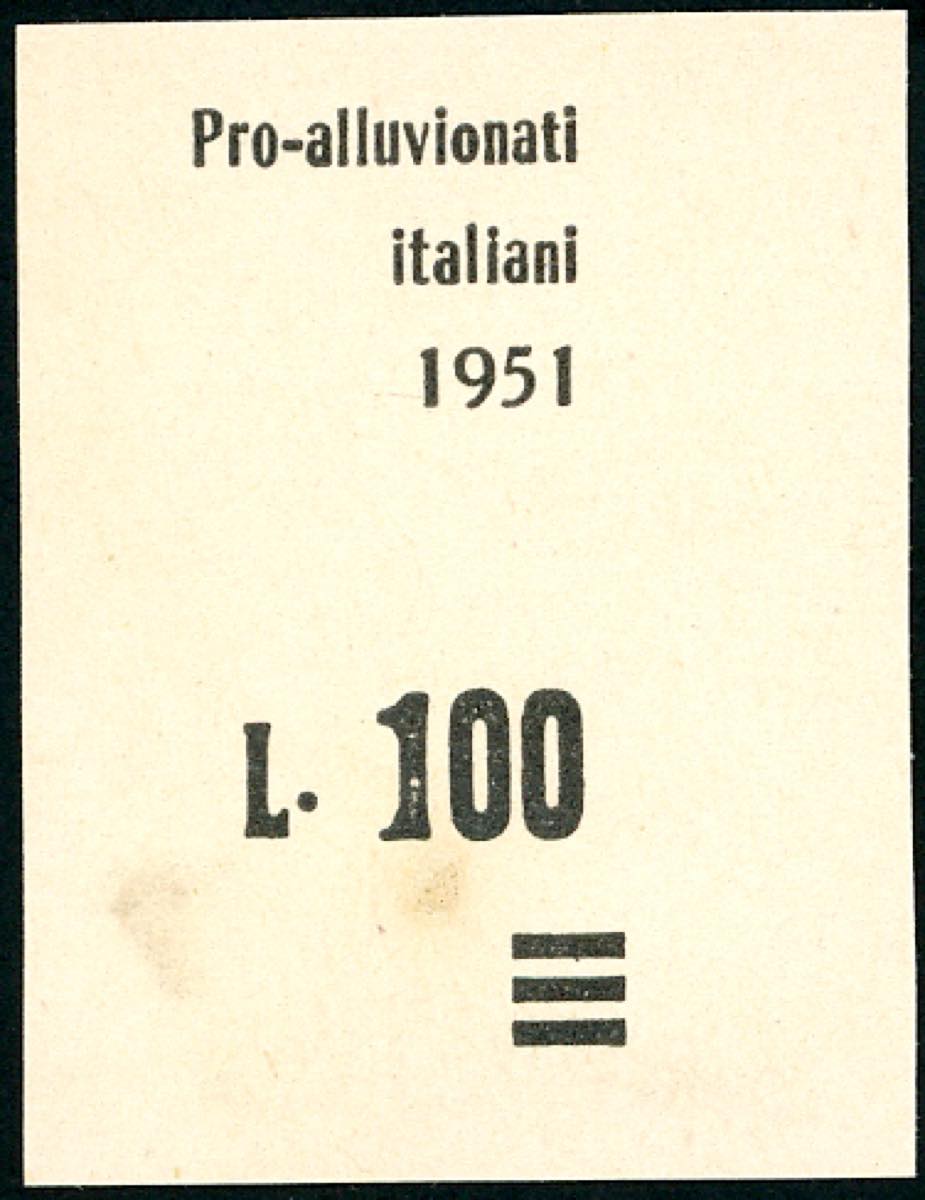 1951 - 100 lire su 250 lire Pro Alluvionati (100), prova della soprastampa in nero su carta avorio, non dentellata, perfetta, senza gomma ... Read more