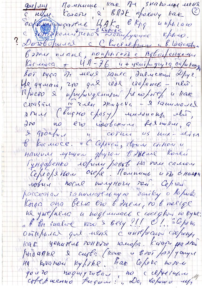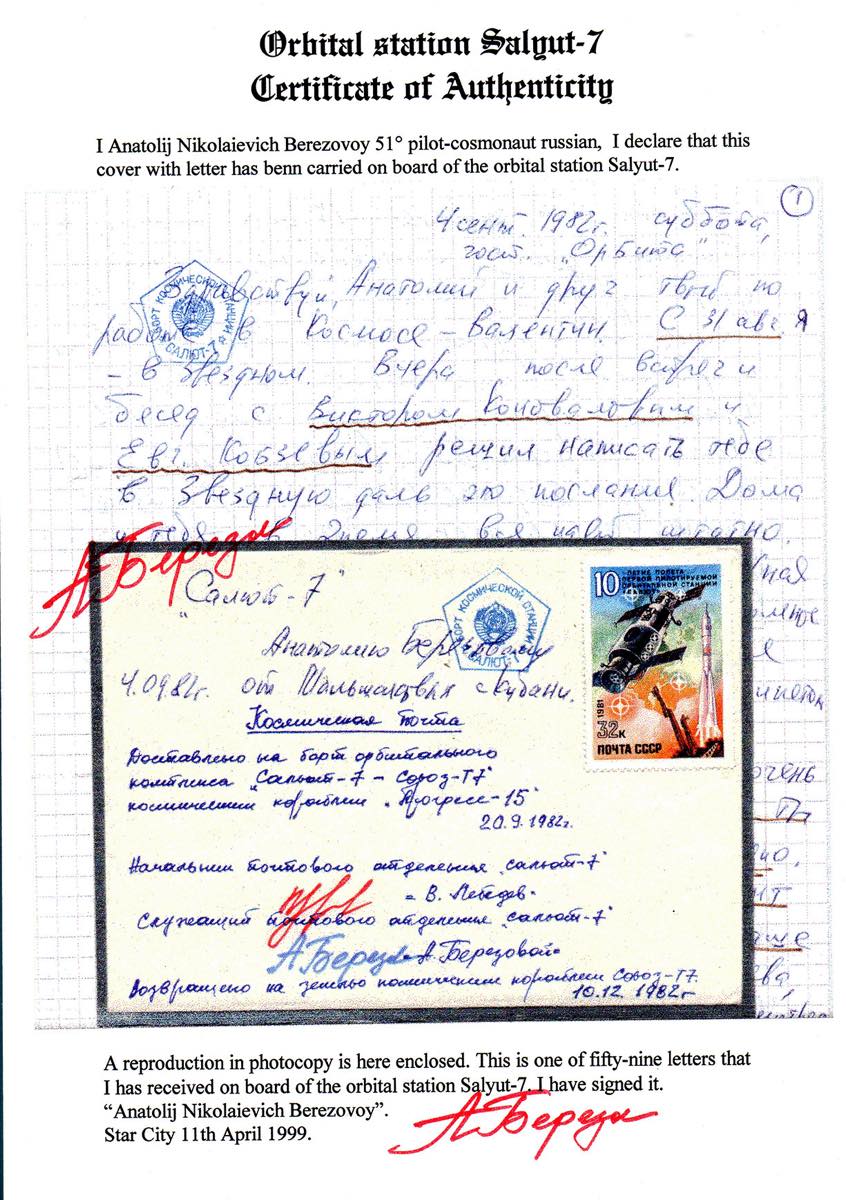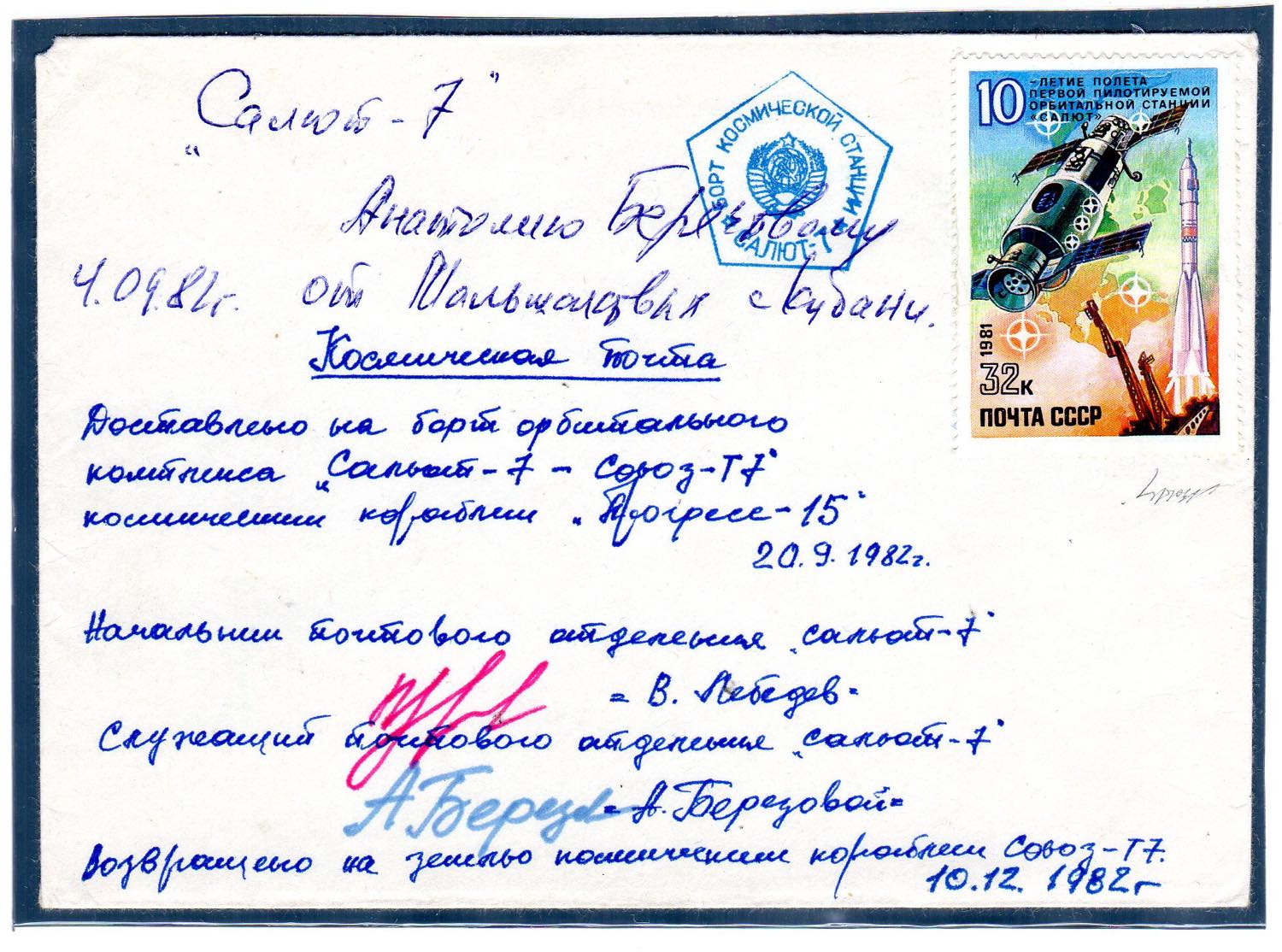 RUSSIA SPAZIO 1982 - Cosmogramma contenente corrispondenza privata Terra-Spazio-Terra del 4/9/1982, indirizzato all'austronauta Anatolij Berezovoy a bordo della Stazione Spaziale Salyut 7, trasportato il 20/9/1982 dalla navicella spaziale Progress-15 e riportato sulla terra dalla navicella spaziale Soyuz-T7 il 10/2/1982.