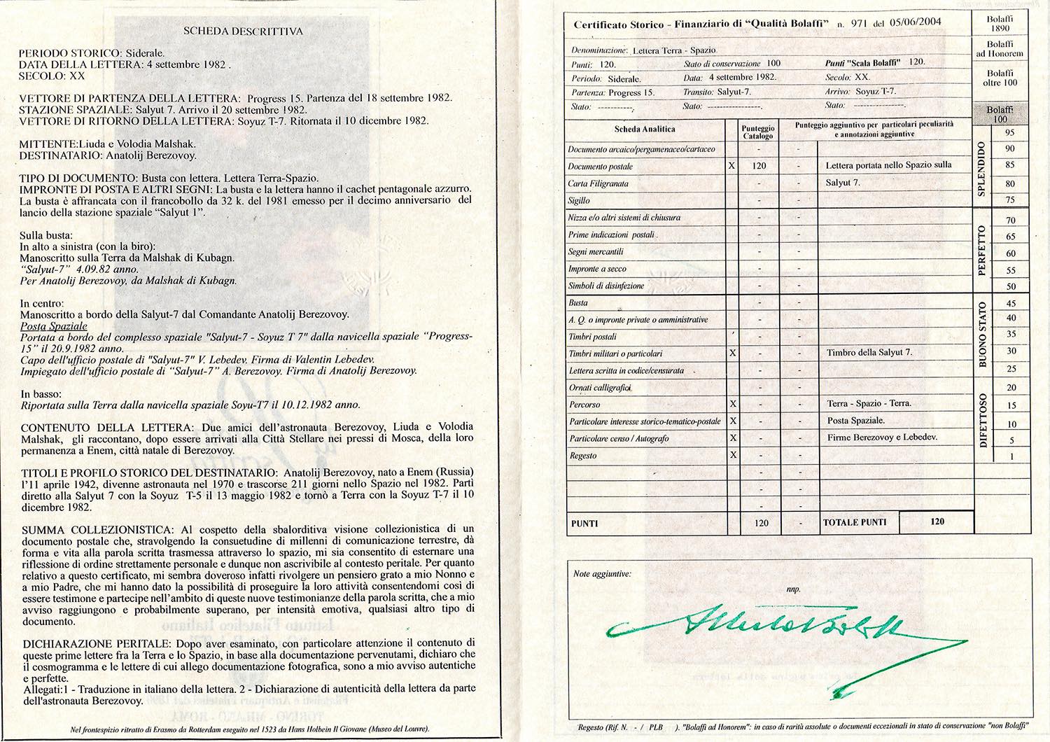 Cert. Storico-Finanziario Bolaffi e dichiarazione di autenticità dell'austronauta Berezovoy.
