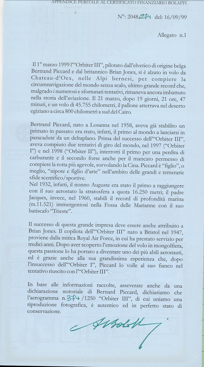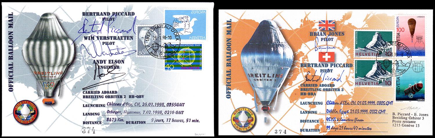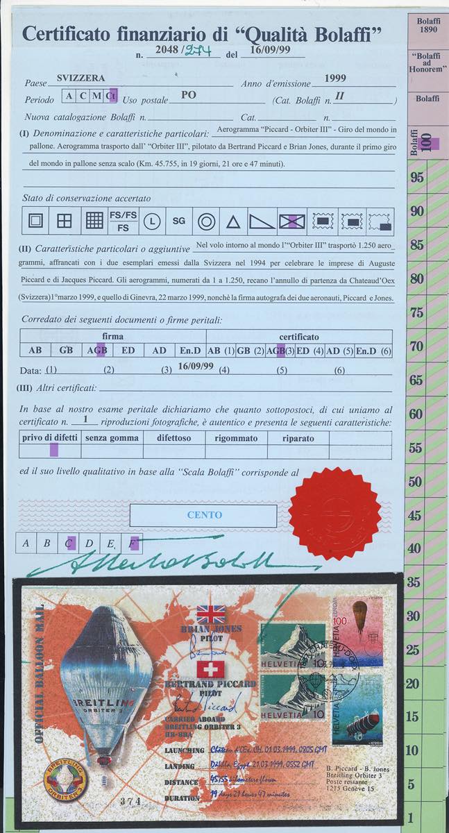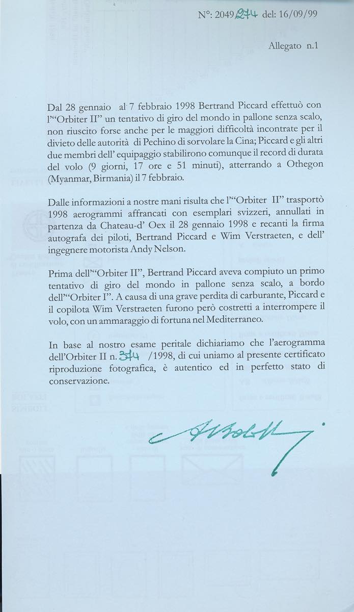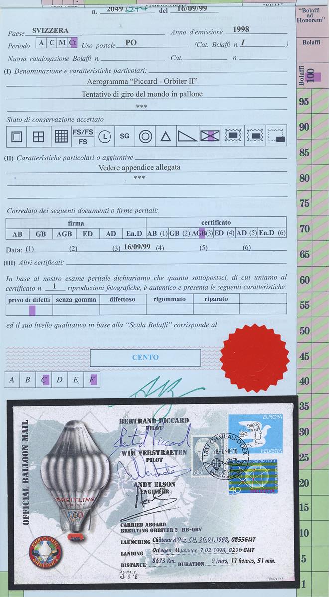 SVIZZERA POSTA AEREA 1998/1999 - I due aerogrammi Orbiter II e Orbiter III, entrambi con autografo di B.Piccard e dell'equipaggio. Il primo del tentativo del giro del mondo del 1998, il secondo del giro del mondo riuscito nel 1999, in mongolfiera. Allegati anche francobollo e busta celebrativi dell'impresa. Il tutto su fogli d'album e cartella dedicata. Ottima qualità. Cert. Finanziario Bolaffi.