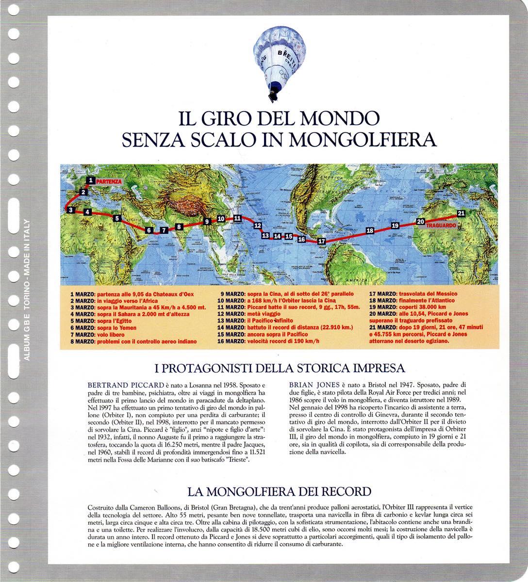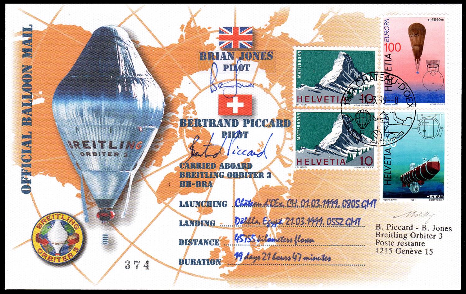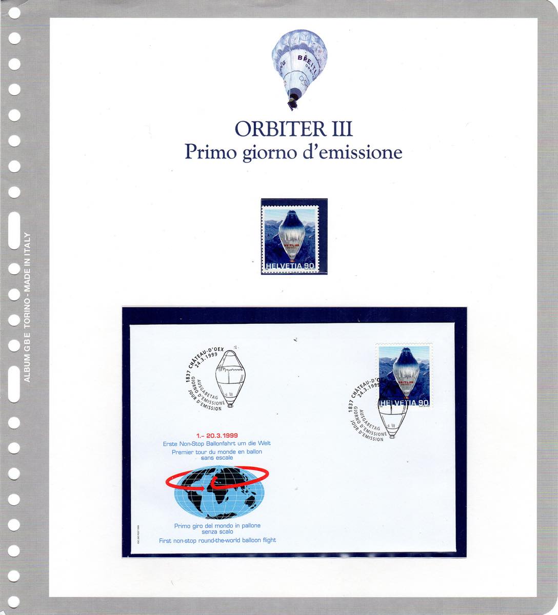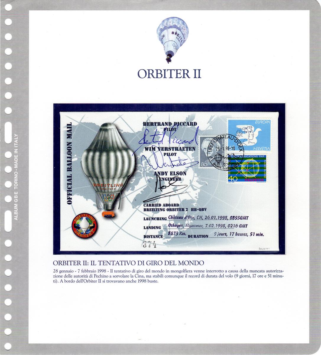 SVIZZERA POSTA AEREA 1998/1999 - I due aerogrammi Orbiter II e Orbiter III, entrambi con autografo di B.Piccard e dell'equipaggio. Il primo del tentativo del giro del mondo del 1998, il secondo del giro del mondo riuscito nel 1999, in mongolfiera. Allegati anche francobollo e busta celebrativi dell'impresa. Il tutto su fogli d'album e cartella dedicata. Ottima qualità. Cert. Finanziario Bolaffi.