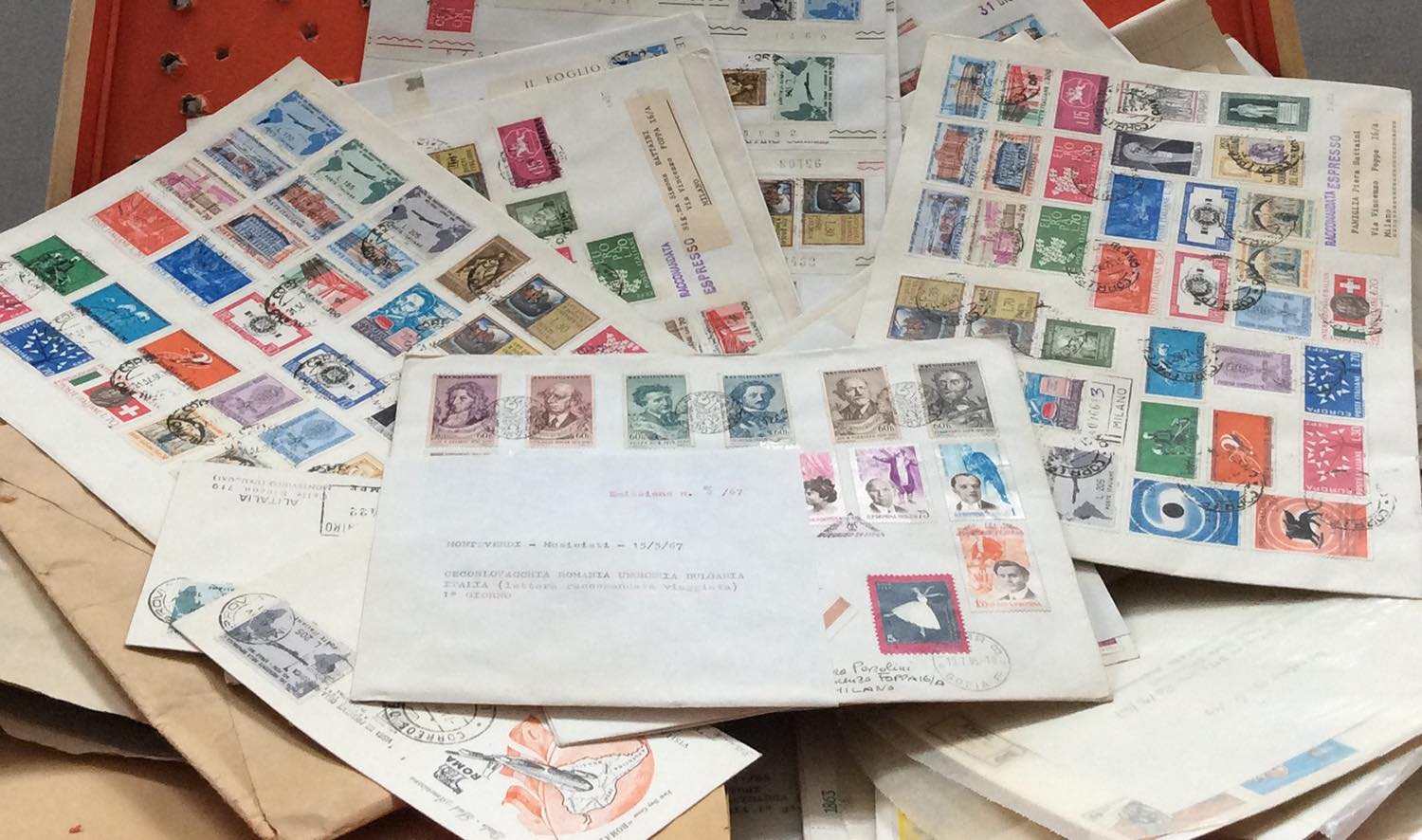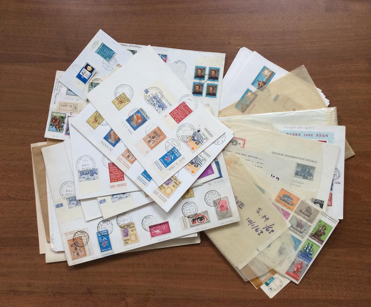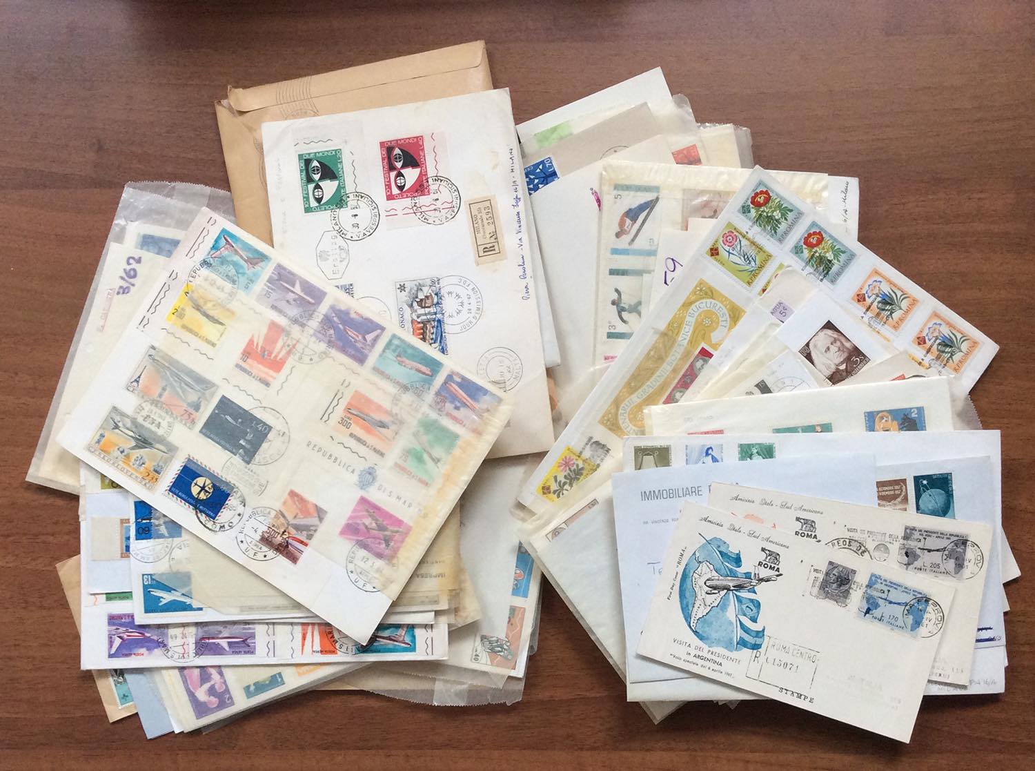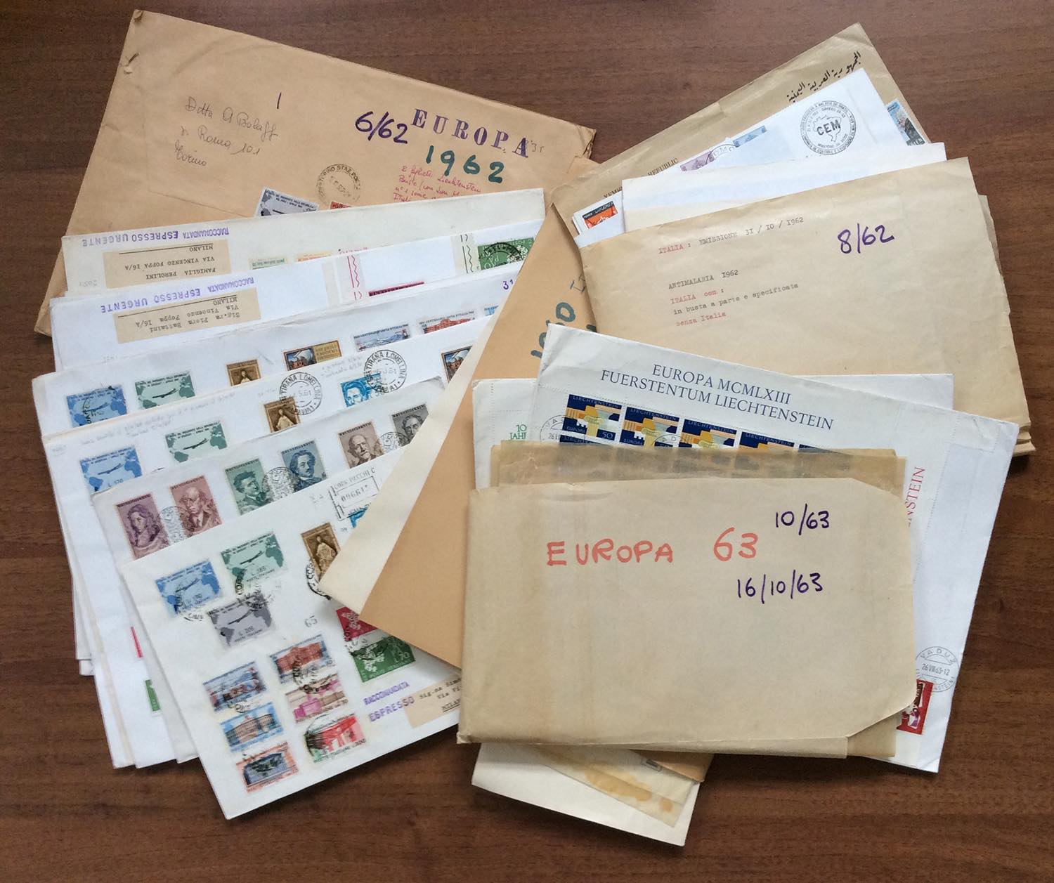 EUROPA 1960/1970 - Accumulazione di buste affrancate del periodo in una scatola. Notate numerose buste con emissioni CEPT e una decina affrancate con la serietta Gronchi di Repubblica. Ottimo per dettaglio e divertente.