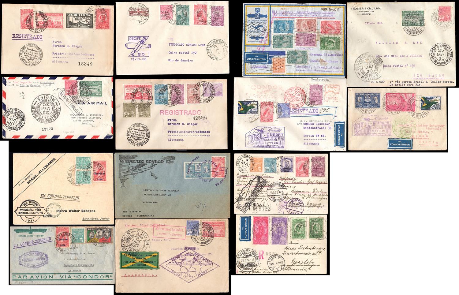 BRASILE POSTA AEREA 1930/1937 - Bell'insieme di 14 aerogrammi affrancati, tutti trasportati via Condor Zeppelin, con buone presenze. Pregevole insieme.