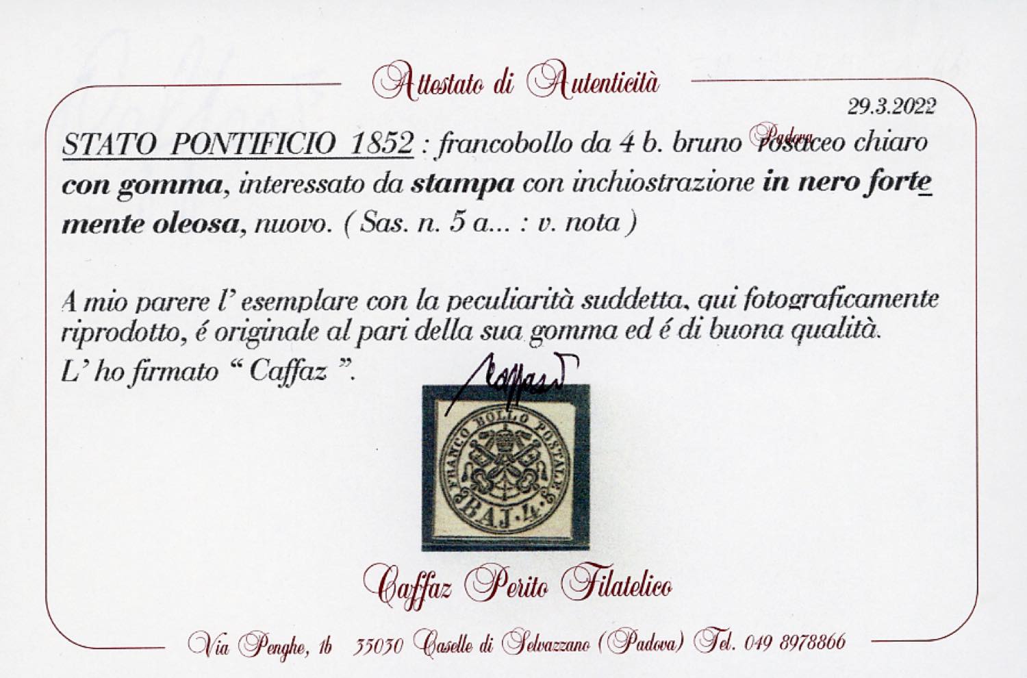 1852 - 4 baj bruno rosaceo chiaro (5a), stampa del nero fortemente oleosa, nitido decalco al verso, gomma originale, perfetto. Raro e molto ... Read more