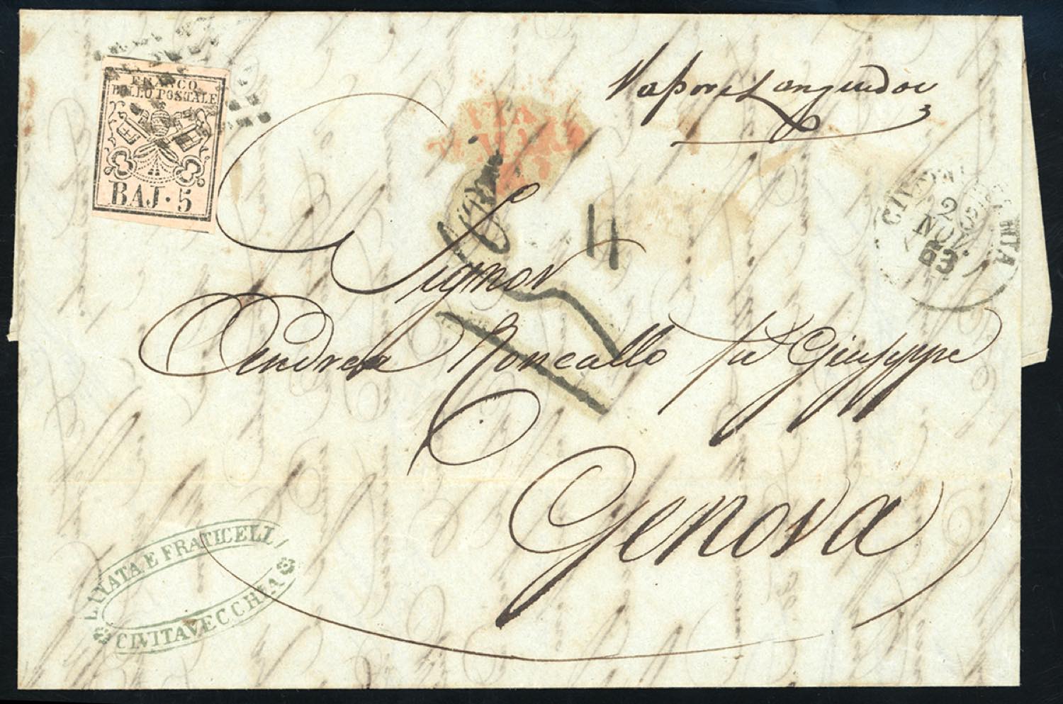 1853 - 5 baj rosa chiaro (6), leggermente intaccato a sinistra, su lettera scritta a Roma 22/11/1853 e messa in posta il giorno successivo a Civitavecchia dal forwarder Lanata e Fraticelli, bollo ovale verde, per Genova, bollo "via di mare" in rosso, tassata 15. Non comune.