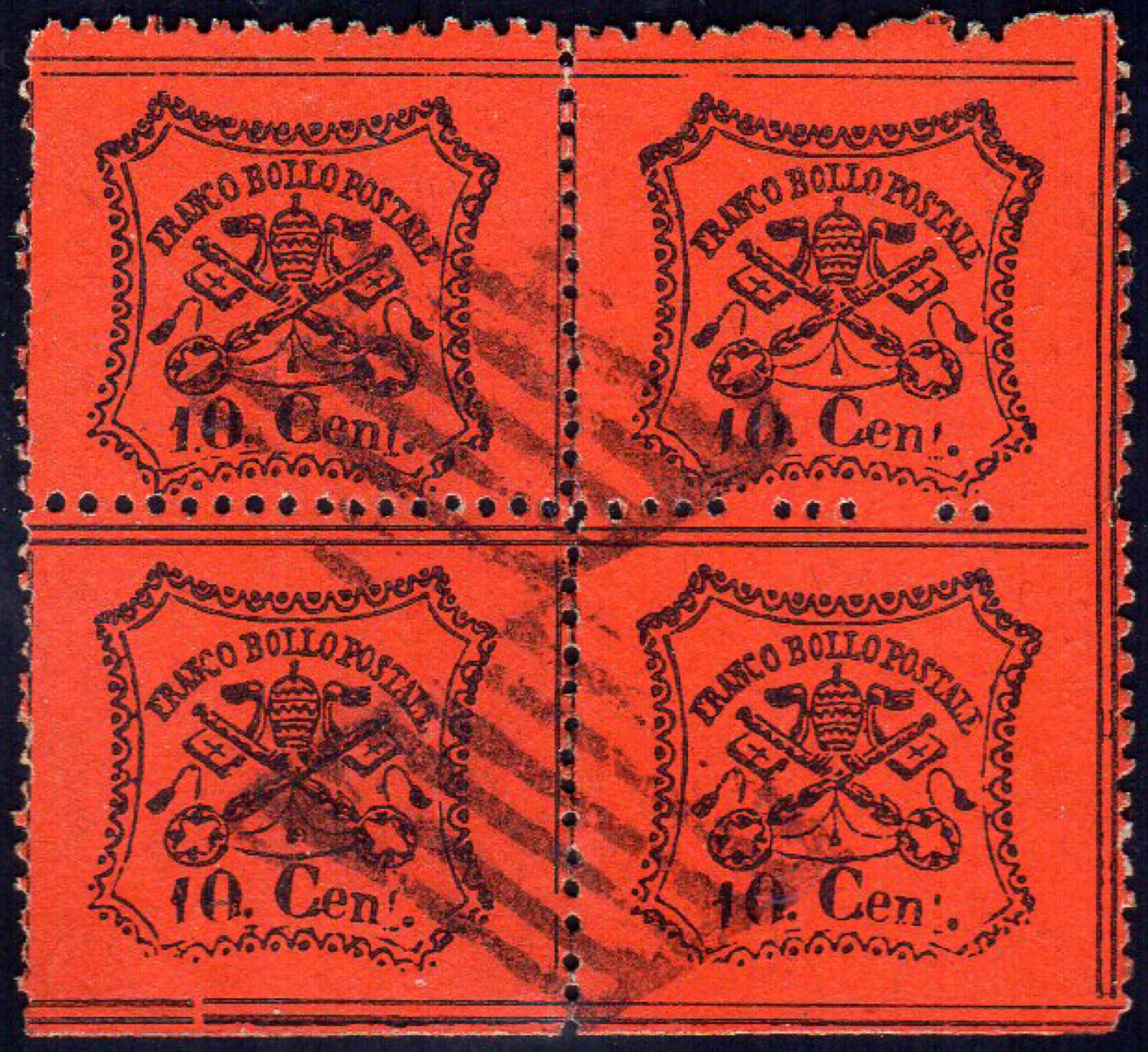 1868 - 10 cent. arancio vermiglio, carta opaca (26c), blocco di quattro, usato, perfetto. G.Oliva, cert. Fiecchi.