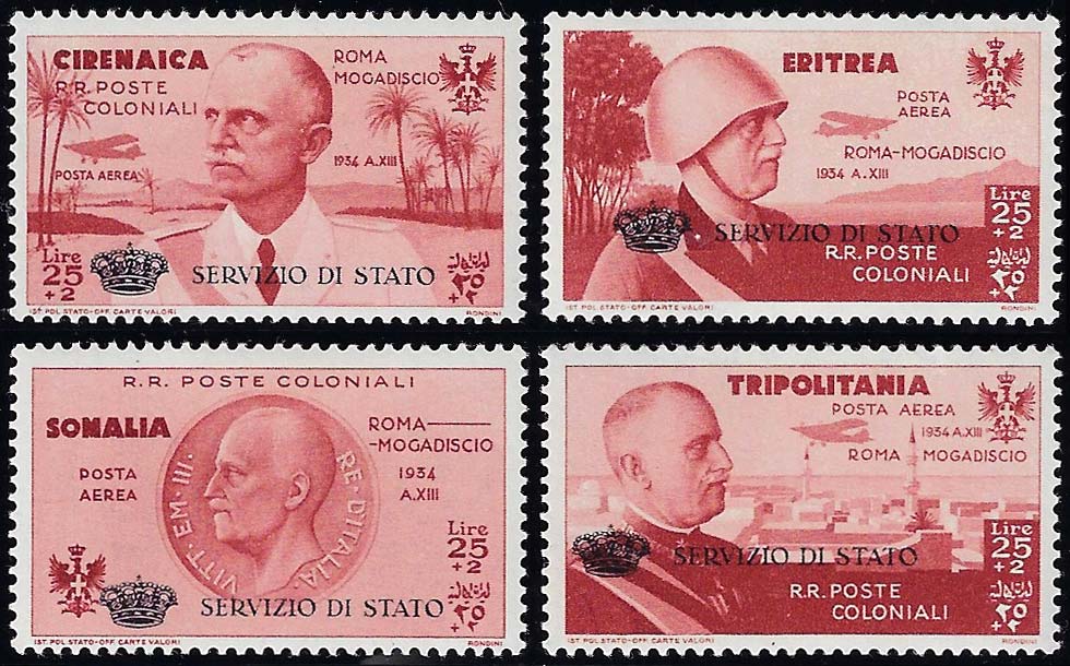 SERVIZIO AEREO 1934 - Coroncina, giro completo delle quattro colonie (1), gomma integra, perfetti. A.Diena, cert. Oro Raybaudi.