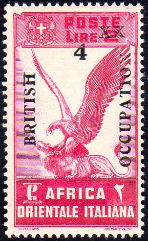 BRITISH OCCUPATION 1941 - 4 lire su 2 lire lilla, trattino sulla H (8c), gomma originale integra, perfetto.