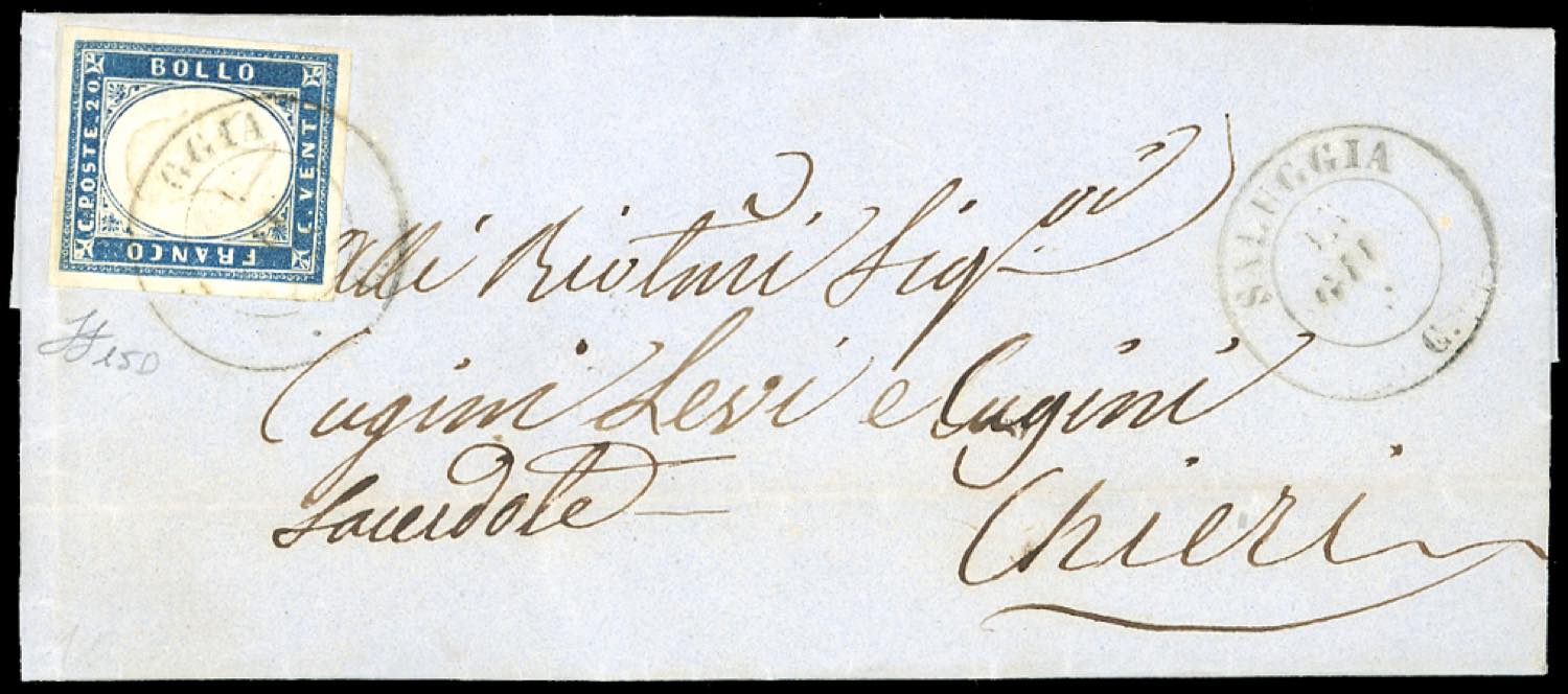 PIEMONTE-SALUGGIA, punti 10 - 20 cent. (15D), perfetto e ben marginato, su lettera del 13/6/1862 per Chieri. Bella. Ferrario.