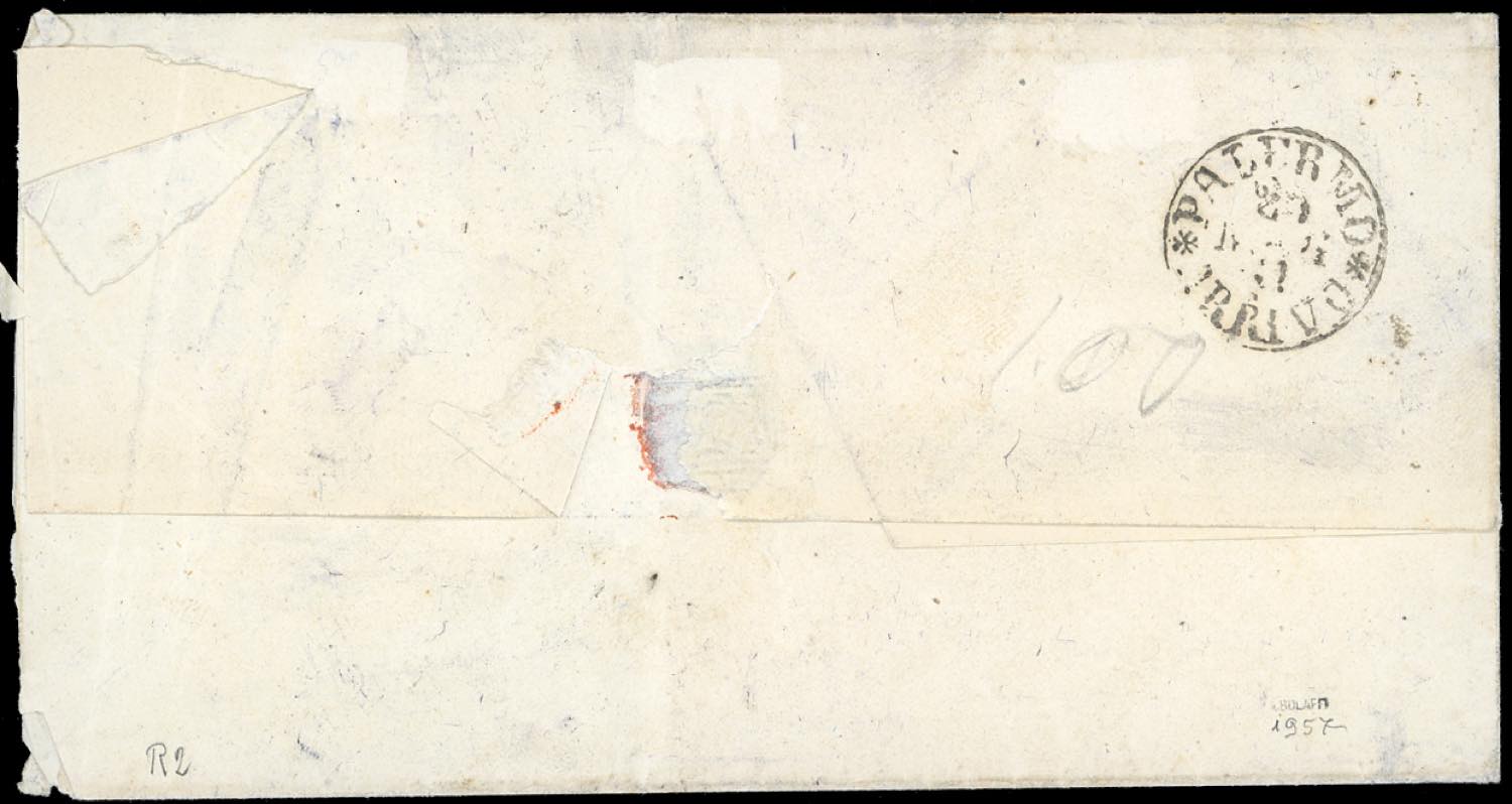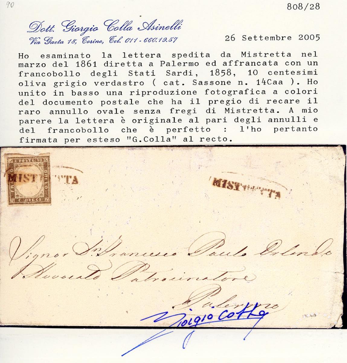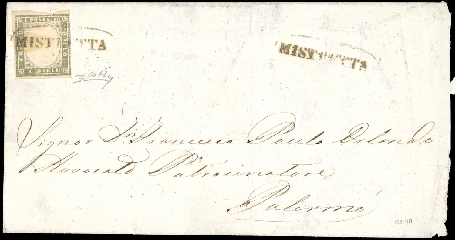 MISTRETTA, ovale punti R2 - 10 cent. oliva grigio verdastro IV emissione di Sardegna (14Caa), ottimo stato, su sovracoperta di lettera per Palermo marzo 1861. Molto rara. Cert. Colla.