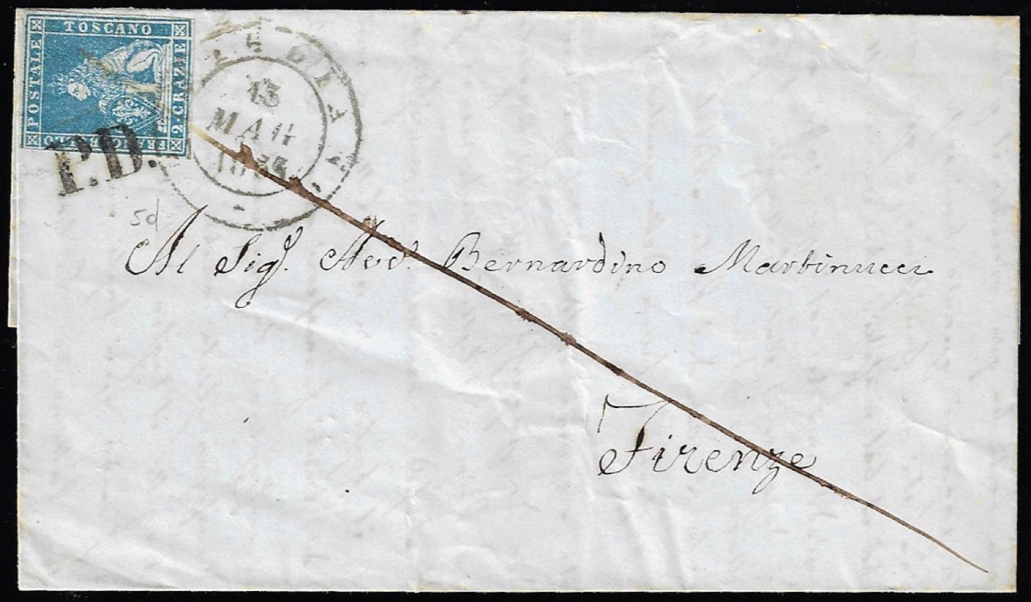 PITIGLIANO, doppio cerchio grande + PD coannullatori - 2 crazie (5d), leggermente intaccato a sinistra, su lettera del 13/5/1854 a Firenze. Combinazione di annulli non catalogata.