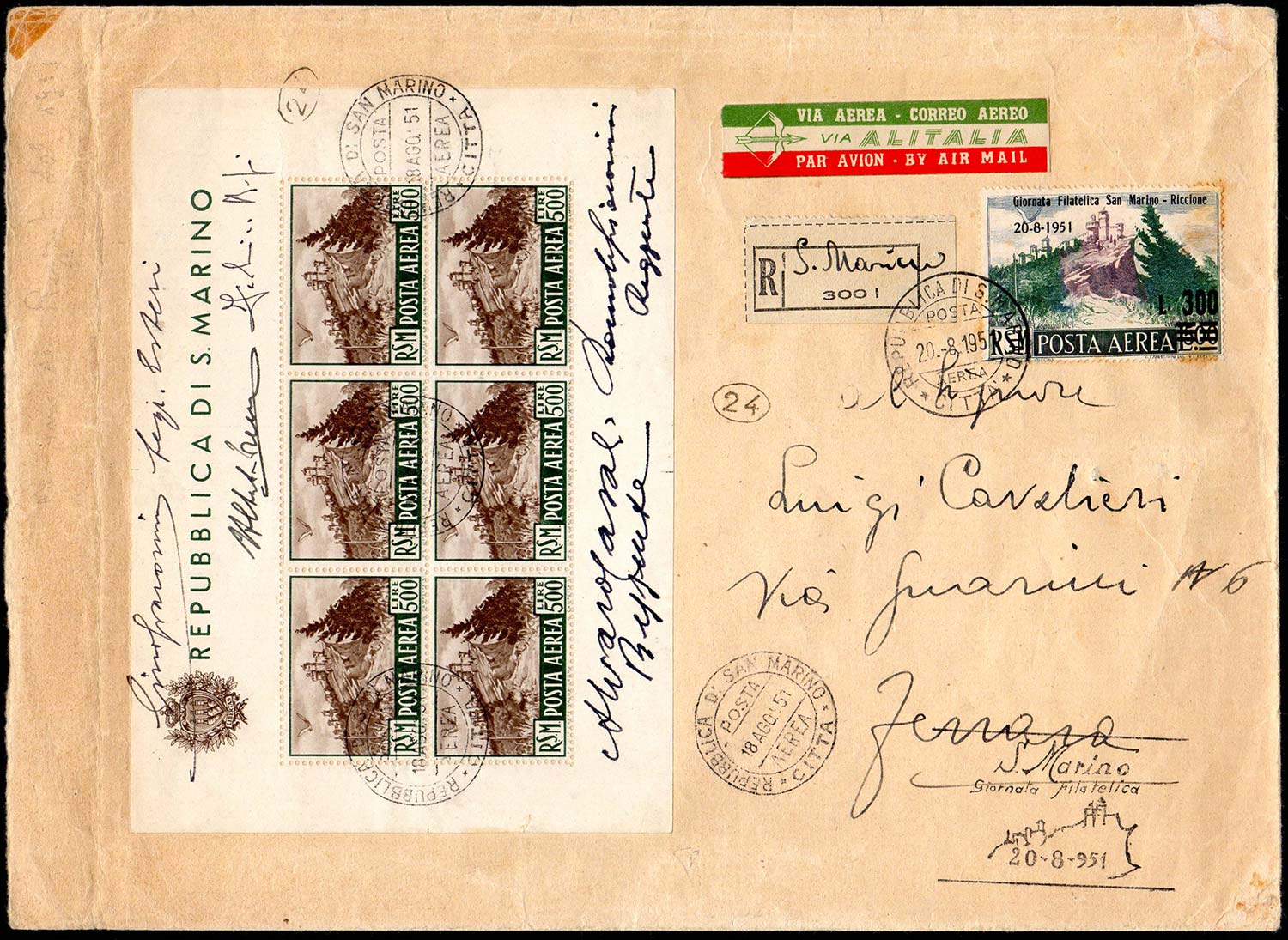 1951 - 500 lire foglietto Veduta (12), 300 lire su 500 lire Giornata Filatelica (98), perfetti, su aerogramma raccomandato da San Marino 18/8/1951 per Ferrara. Il foglietto è stato autografato dai Capitani Reggenti, dal Segretario degli Esteri e dai filatelisti A.Diena e F.Bargagli Petrucci. Insieme raro. Cert. Diena.