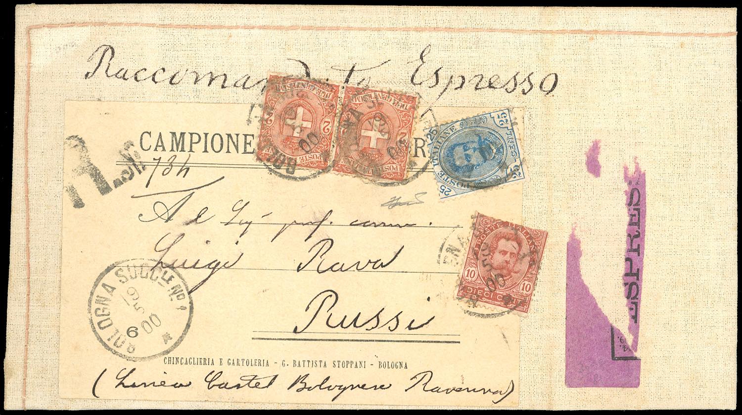 1900 - 10 cent., 25 cent, 2 cent., coppia, Umberto I (60,62,66), su busta telata contenente un campione senza valore spedito per raccomandata espresso da Bologna 19/5/1900 a Russi, bollo d'arrivo. Interessante e raro insieme. Ferrario.