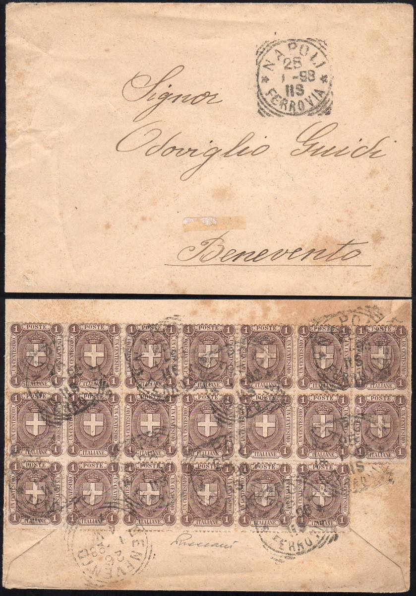 1898 - 1 cent. Stemma (65), blocco di venti esemplari, al verso di busta da Napoli 26/1/1898 a Benevento. Molto rara! Chiavarello, cert. Vaccari.