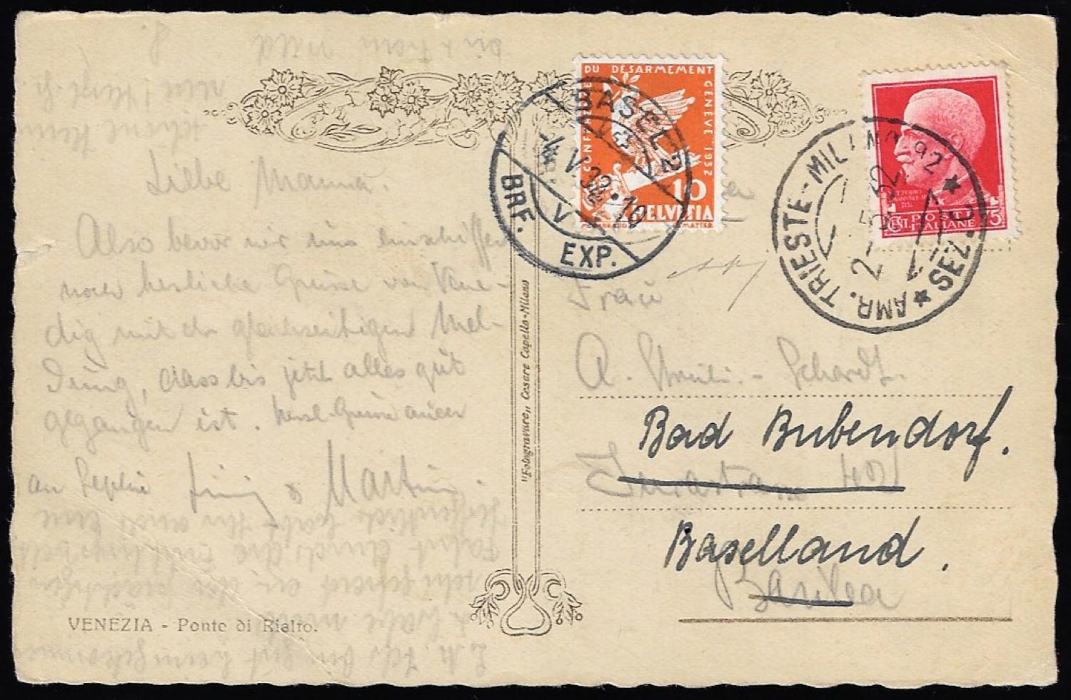 1932 - 75 cent. Imperiale (252), perfetto, su cartolina da Venezia, annullato con il bollo dell'ambulante Trieste - Milano 2/5/1932, a Basilea, rispedita a Baselland dopo essere stata riaffrancata con 10 cent. Conferenza sul disarmo (Svizzera 255). Bella mista di rispedizione. A.Bolaffi.