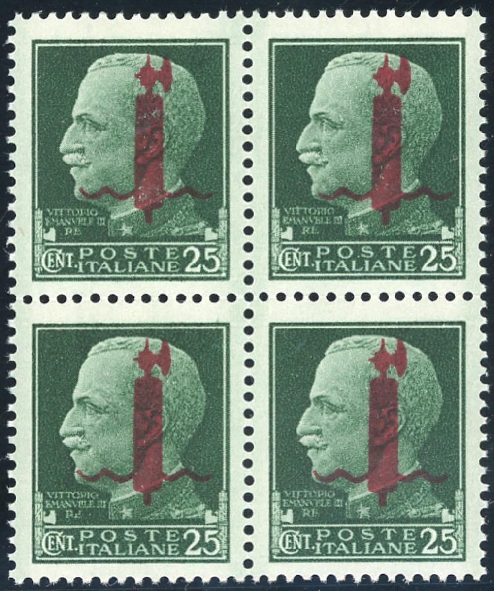Lot 1388 - 1944 - 25 cent. soprastampato fascio in rosso (490), blocco ...