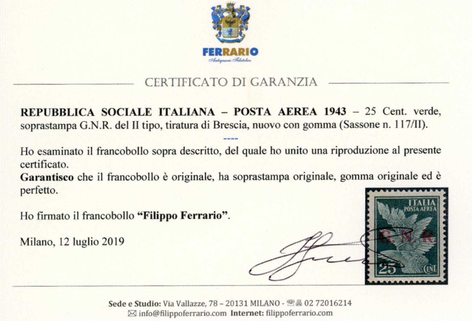 1943 - 25 cent. soprastampa G.N.R. di Brescia, II tipo (117/II), gomma originale, perfetto. Raro! Cert. Ferrario.